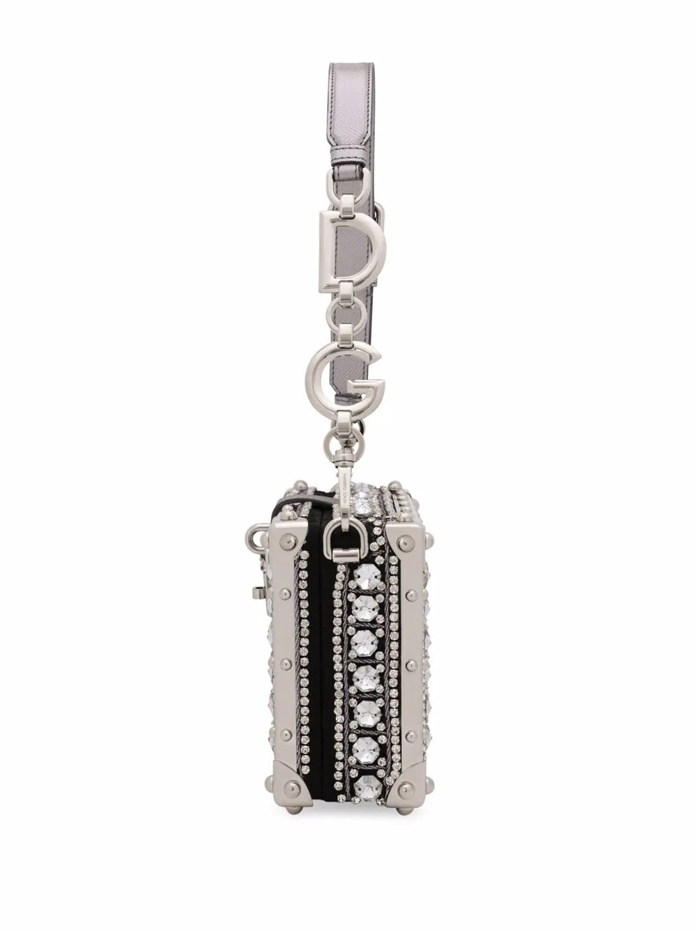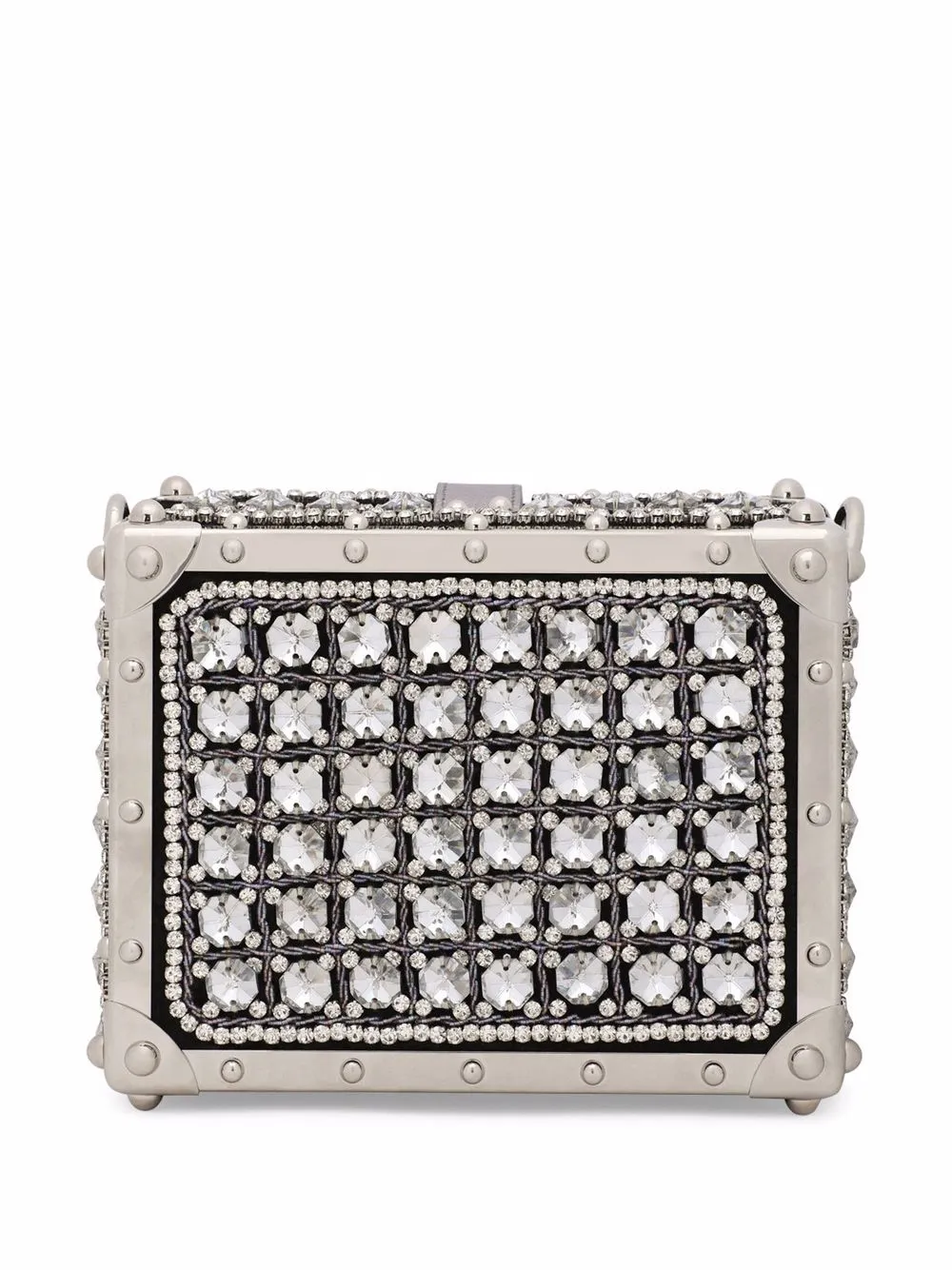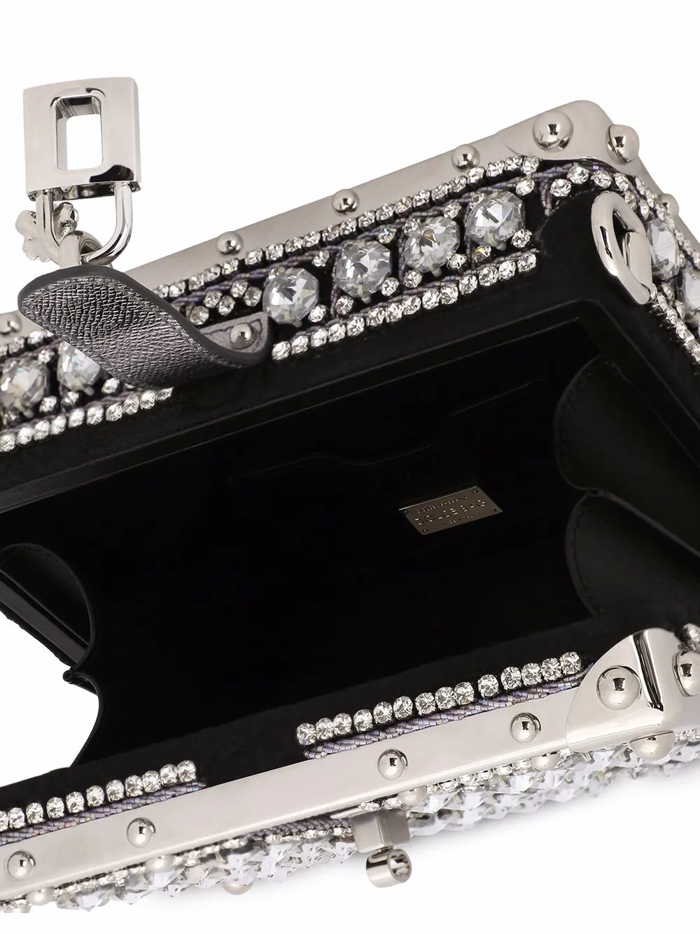 Декор из кристаллов, серебристая фурнитура, кожаная отделка, серебристый металлический логотип, потайная застежка на магните, основное отделение, внутренний прорезной карман, металлический логотип внутри и съемная верхняя ручка.