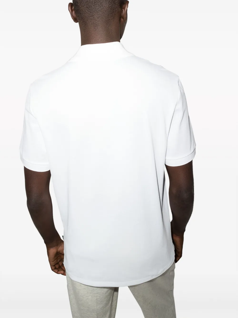 Белый, хлопок, воротник поло, короткие рукава, вышитый логотип на груди и прямой подол.