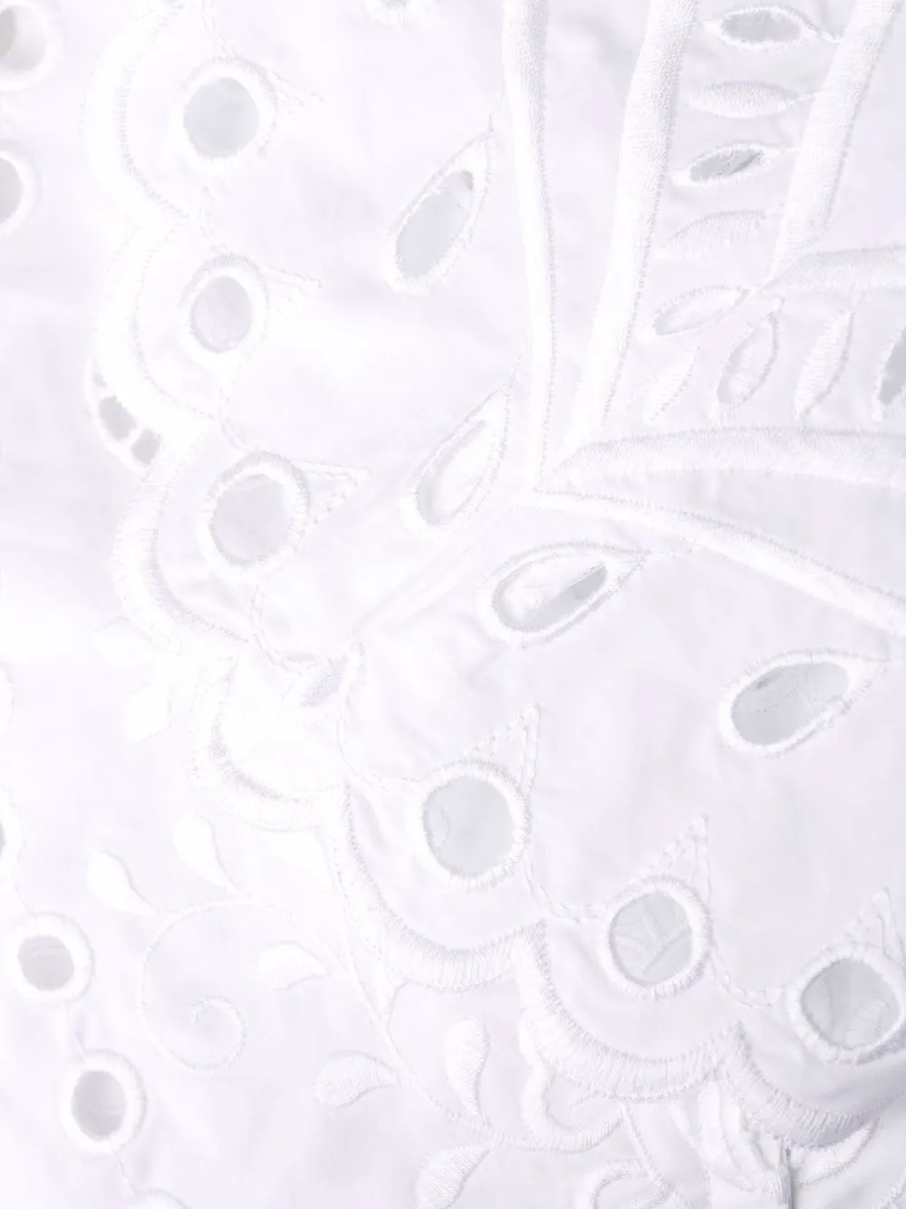 Однотонная расцветка, вырезные детали, вышивка, круглый вырез, длинные рукава и края с фестонами. Цвет: белый.