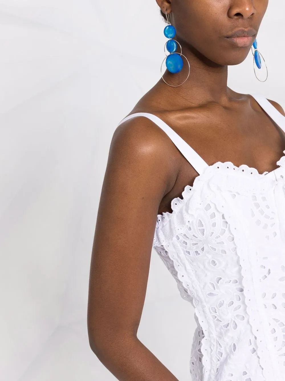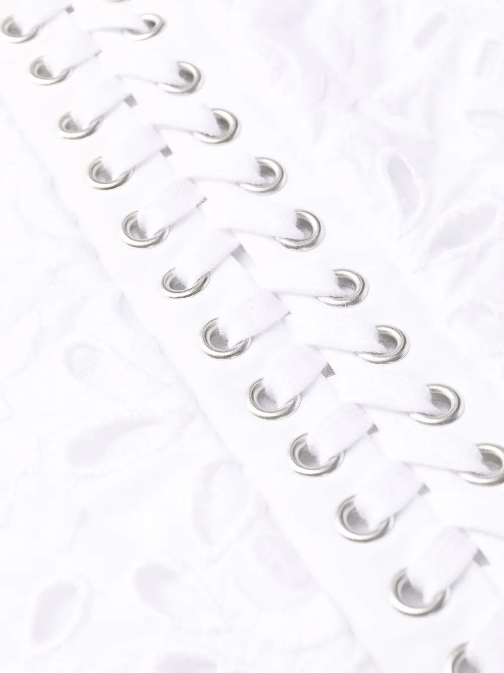 Шнуровка спереди, верх в корсетном стиле, вставки из цветочного кружева, вырез в форме сердца, узкие бретели, потайная застежка на молнии сзади и края с фестонами. Цвет: белый.