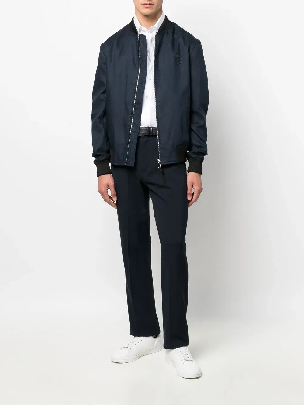 Белый, лен, узор с эмблемой, прямой воротник, рукава по локоть и прямой подол. .