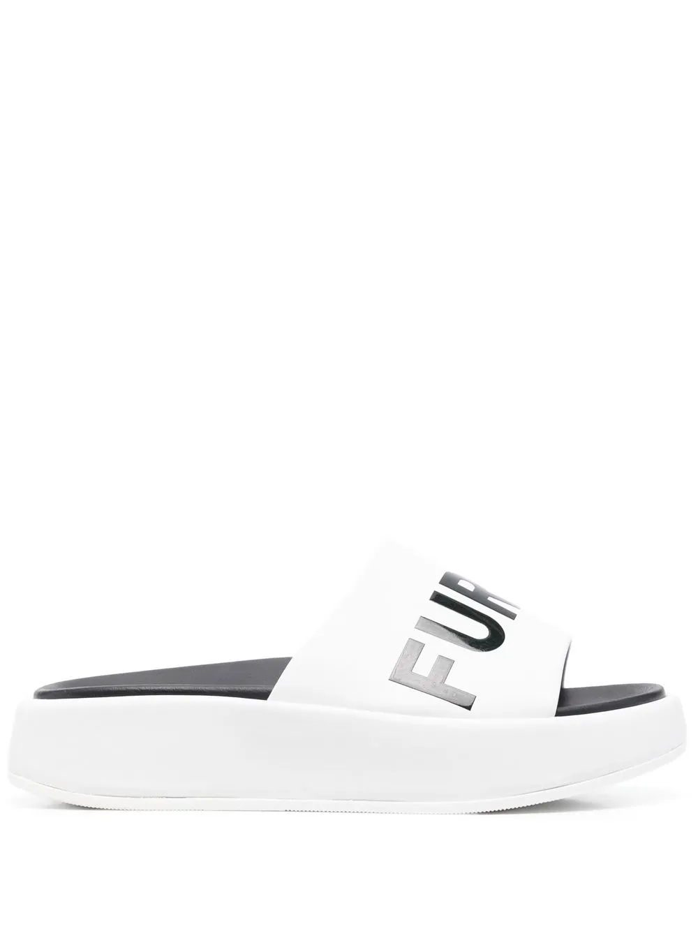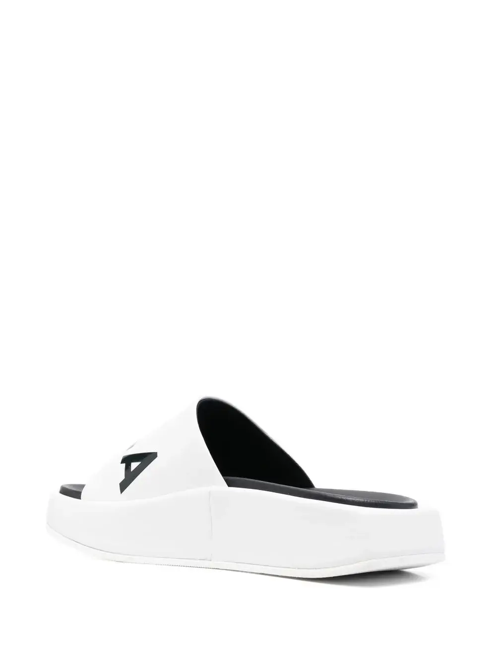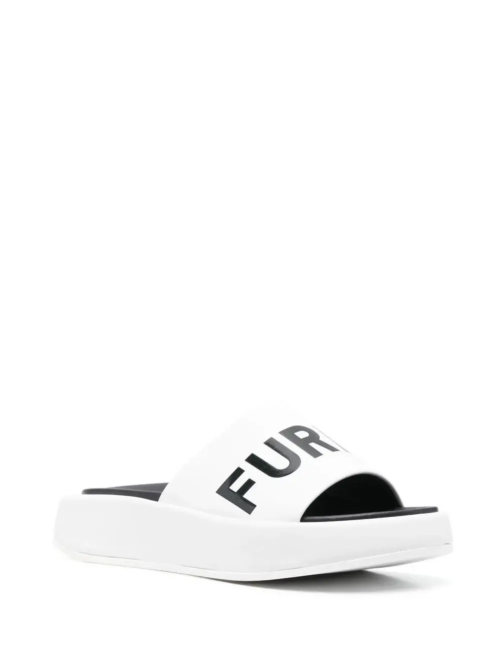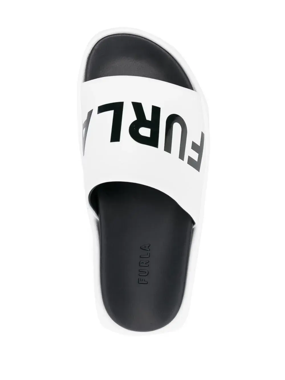 Двухцветная деталь, принт с логотипом, открытый носок, открытая спина, модель без застежки и подошва на платформе.
