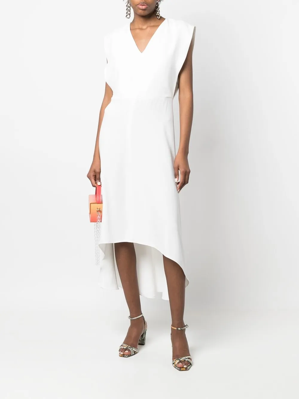 V-образный вырез, без рукавов, потайная застежка на молнии сзади, неравномерный подол и длина миди.