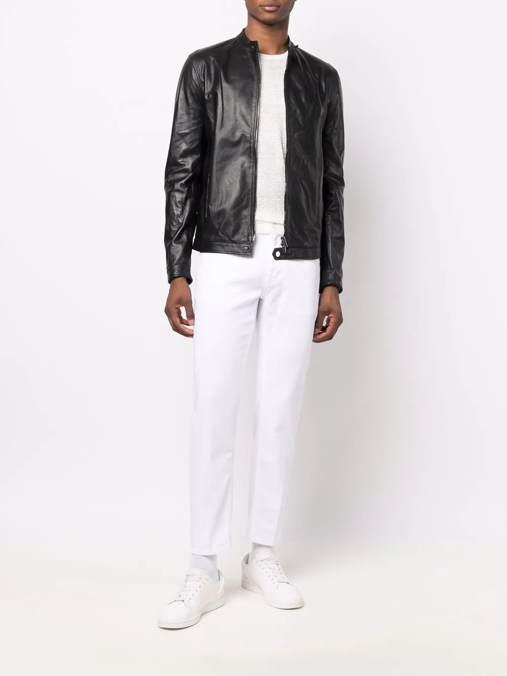 Узкий крой, нашивка с логотипом сзади, средняя посадка, петли для ремня, застежка на молнии и пуговице спереди, классическая пятикарманная модель и укороченная длина.