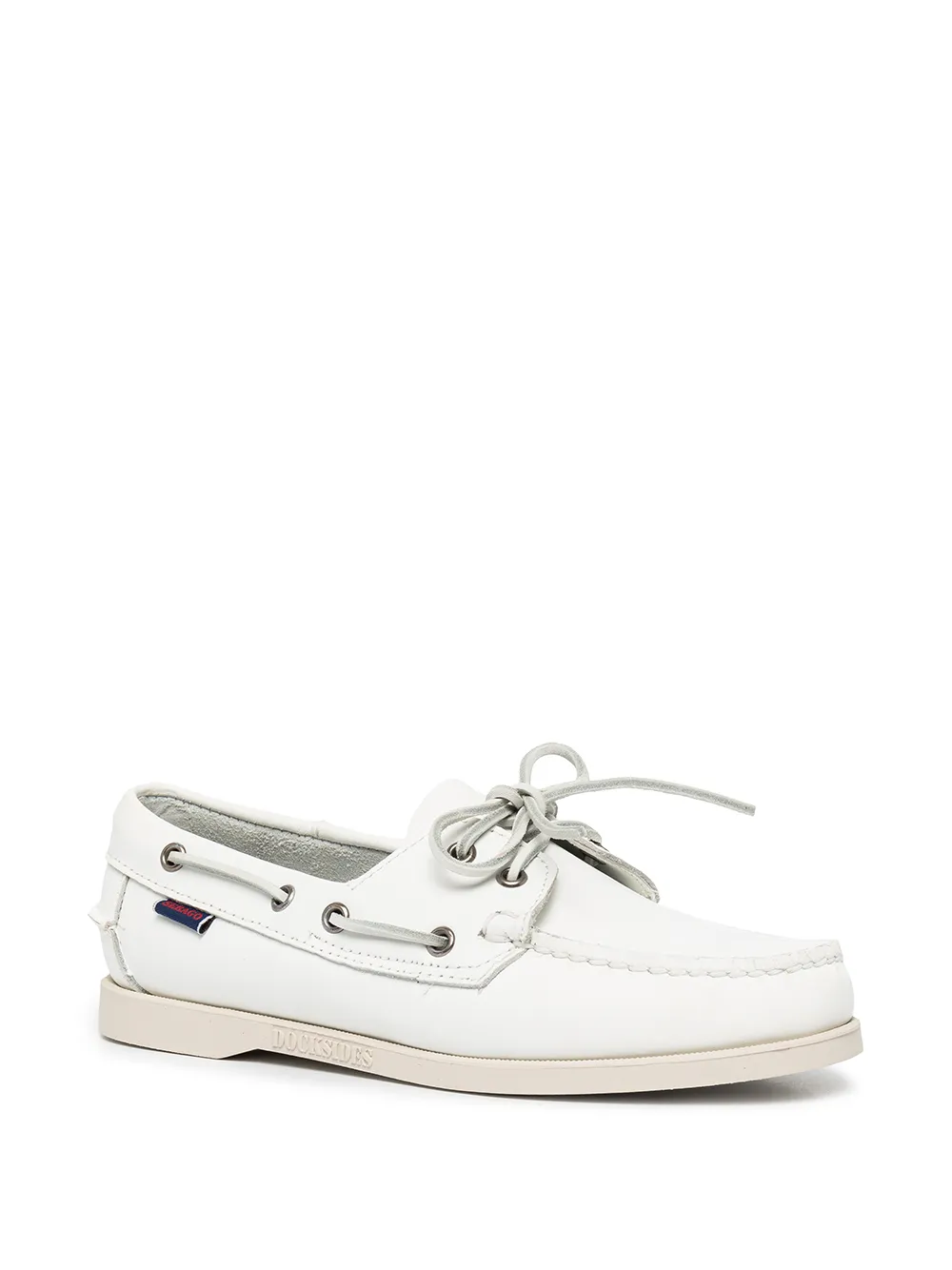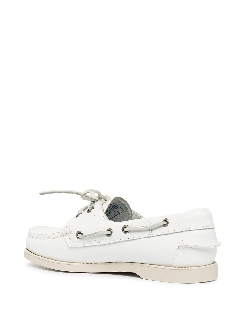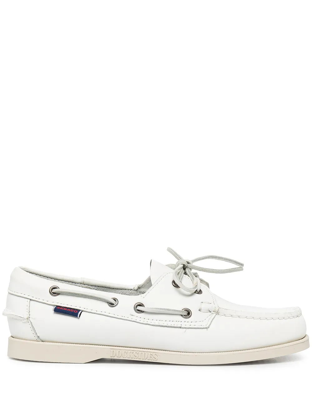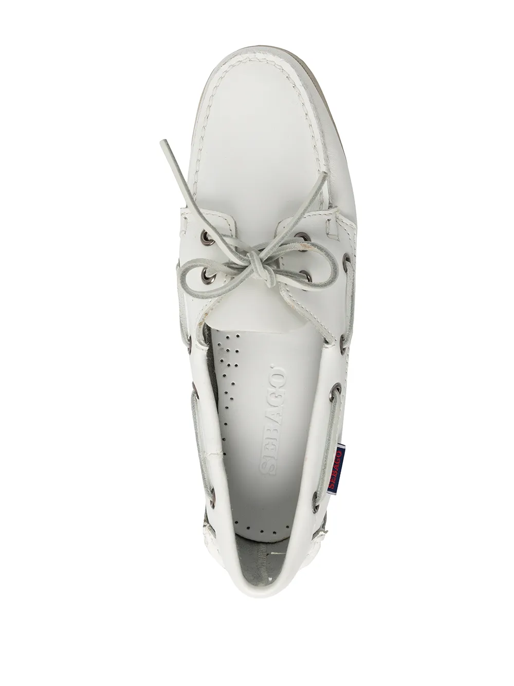 Белый, кожа, люверсы, шнуровка спереди, закругленный носок, плоская подошва и стелька с логотипом.