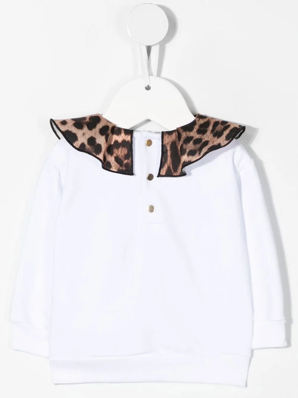 Белый/разноцветный, эластичный хлопок, воротник с оборками, леопардовый принт, логотип спереди, длинные рукава, прямой подол и круглый вырез.
