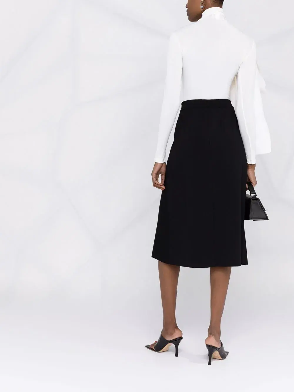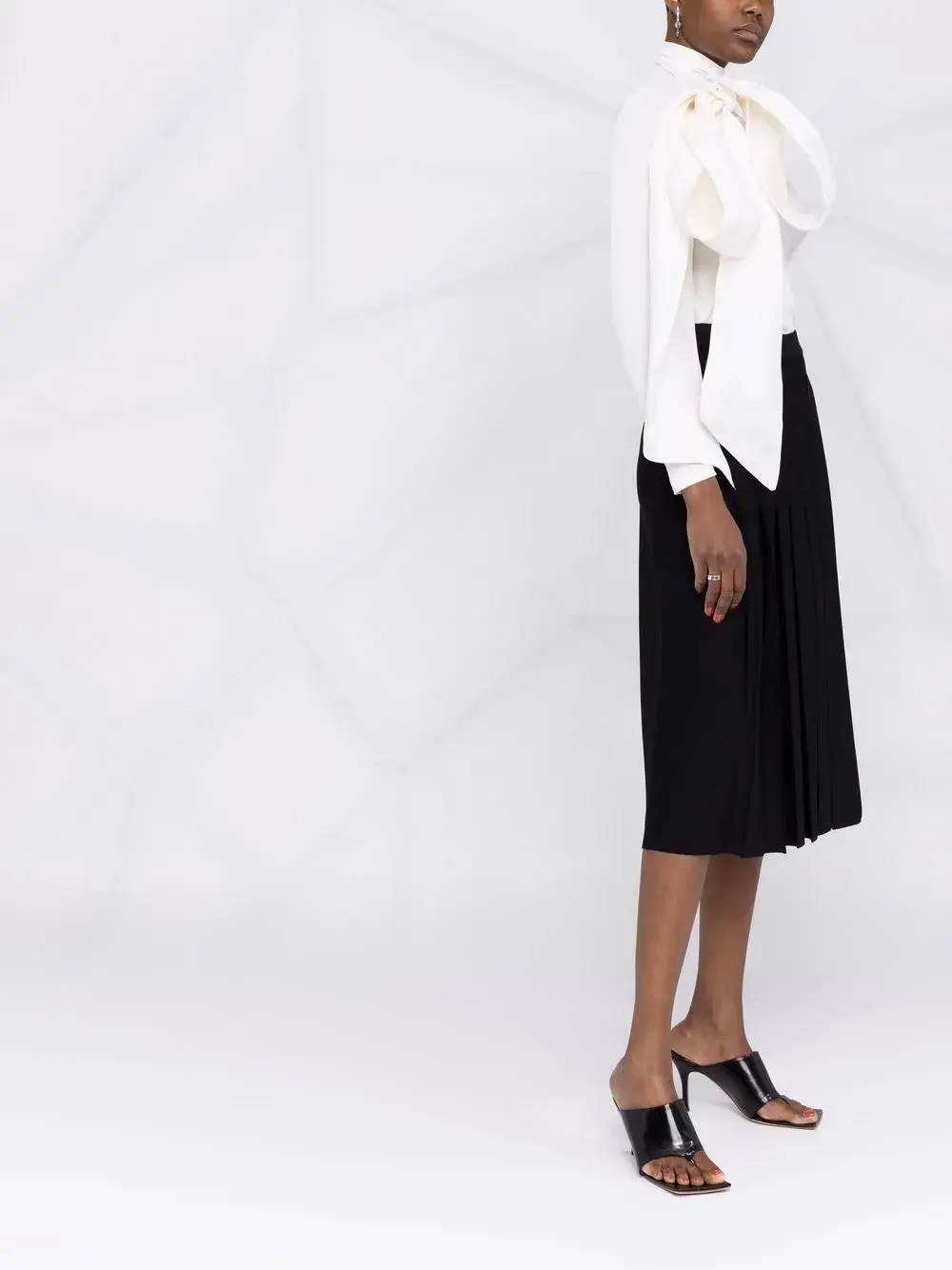 Крупный бант, высокий воротник, длинные рукава и прямой подол. Цвет: белый.
