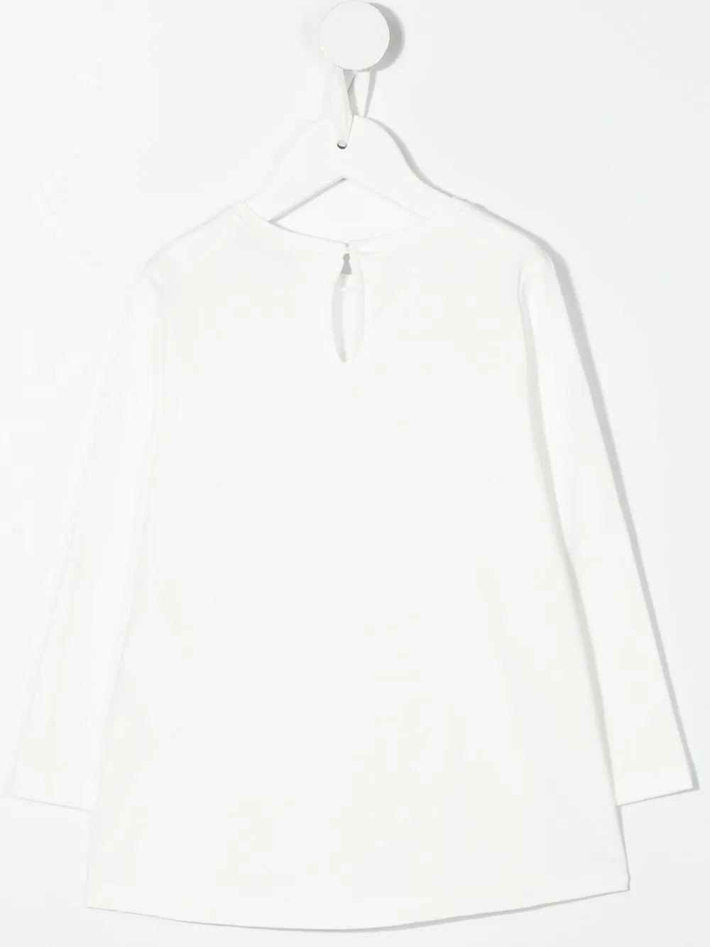 Белый, хлопок, графичный принт спереди, круглый вырез, вырез сзади, длинные рукава и прямой подол.