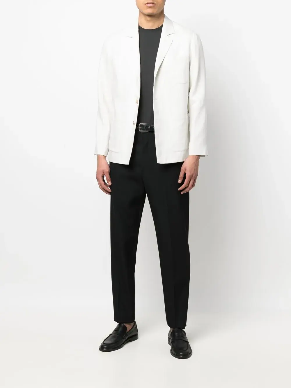 Белый, лен/шелк, зазубренные лацканы, застежка на пуговицах спереди, нагрудный накладной карман, два накладных кармана спереди, длинные рукава и прямой подол. .