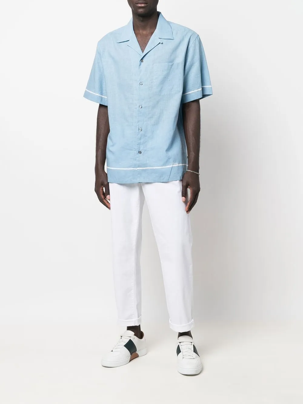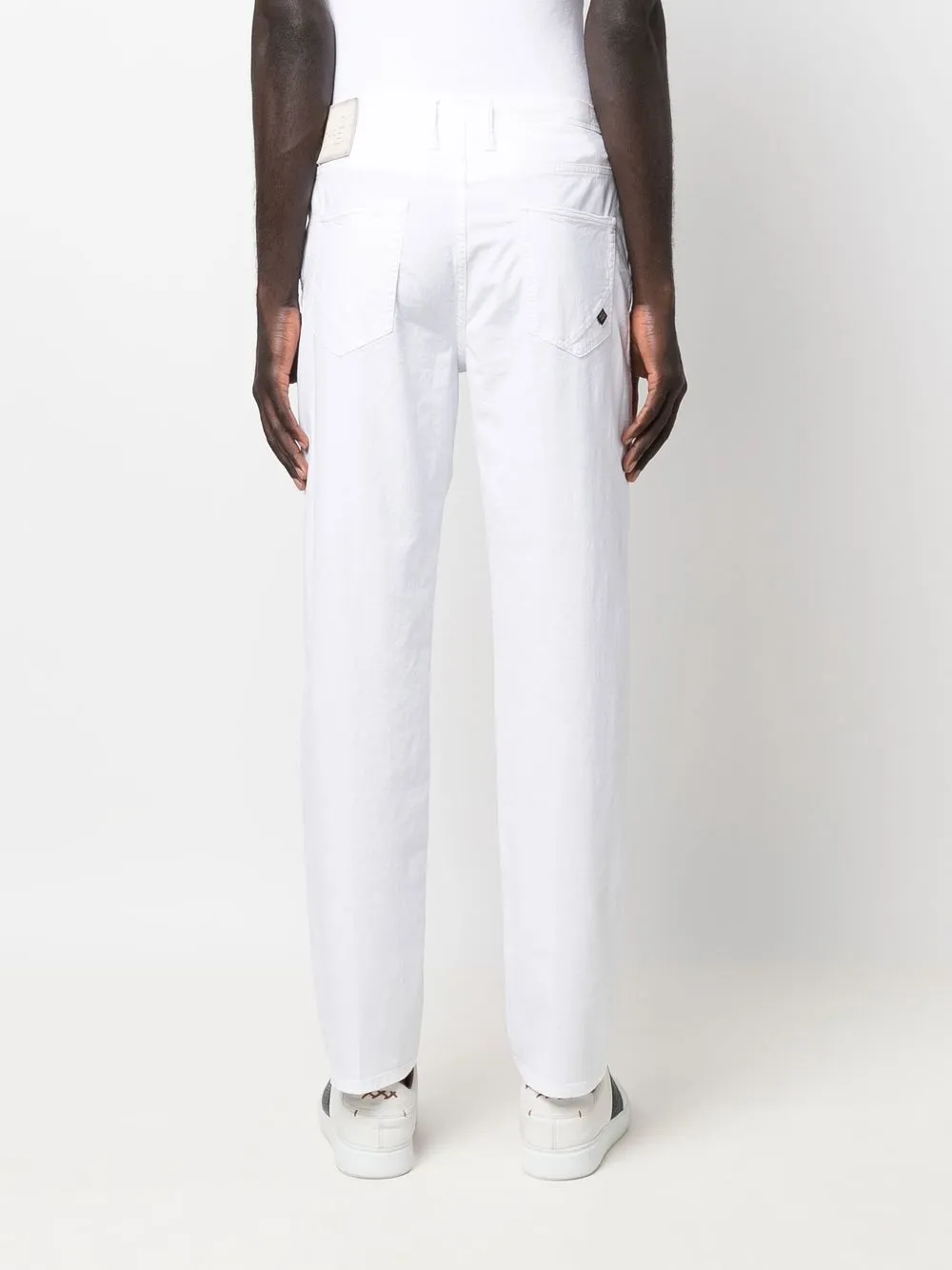 Белый, хлопок, плиссировка, петли для ремня, застежка на молнии и пуговице спереди, два прорезных кармана по бокам и два кармана с листочкой сзади.