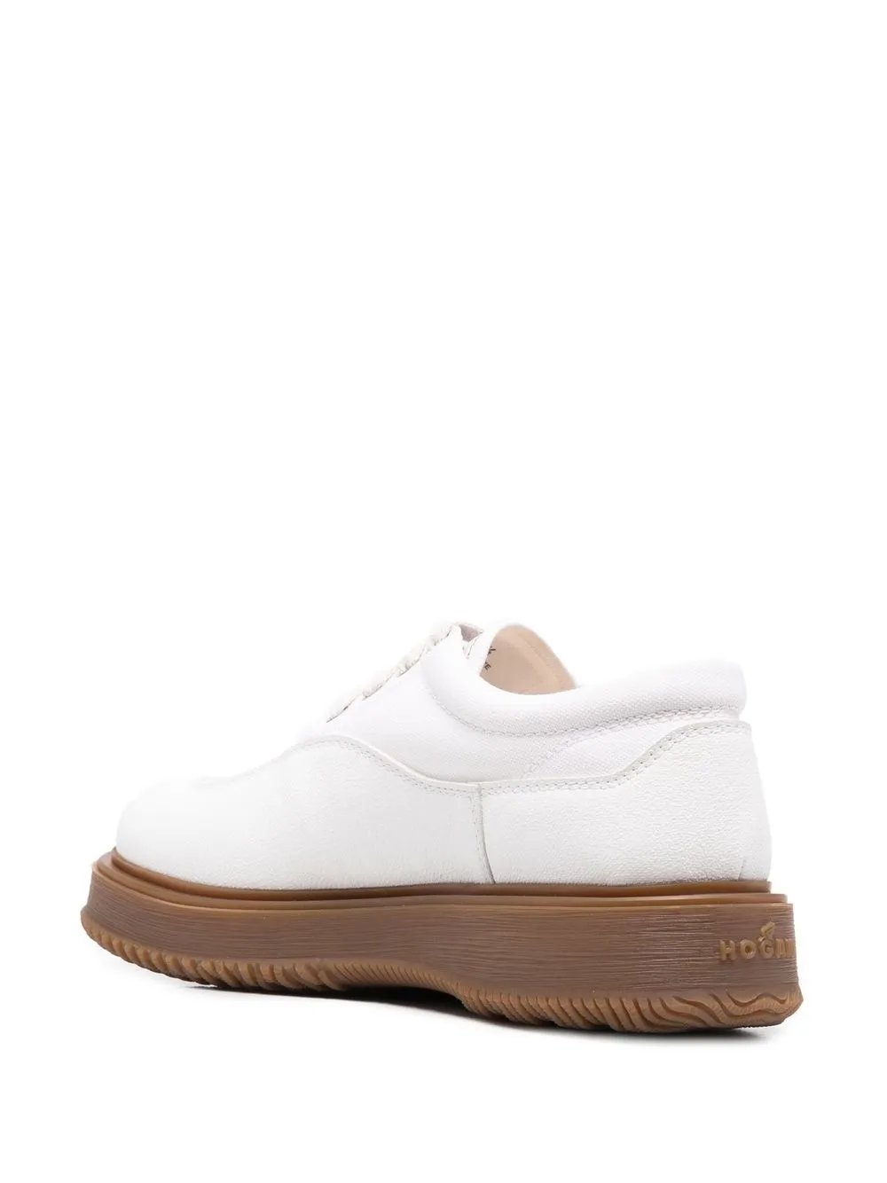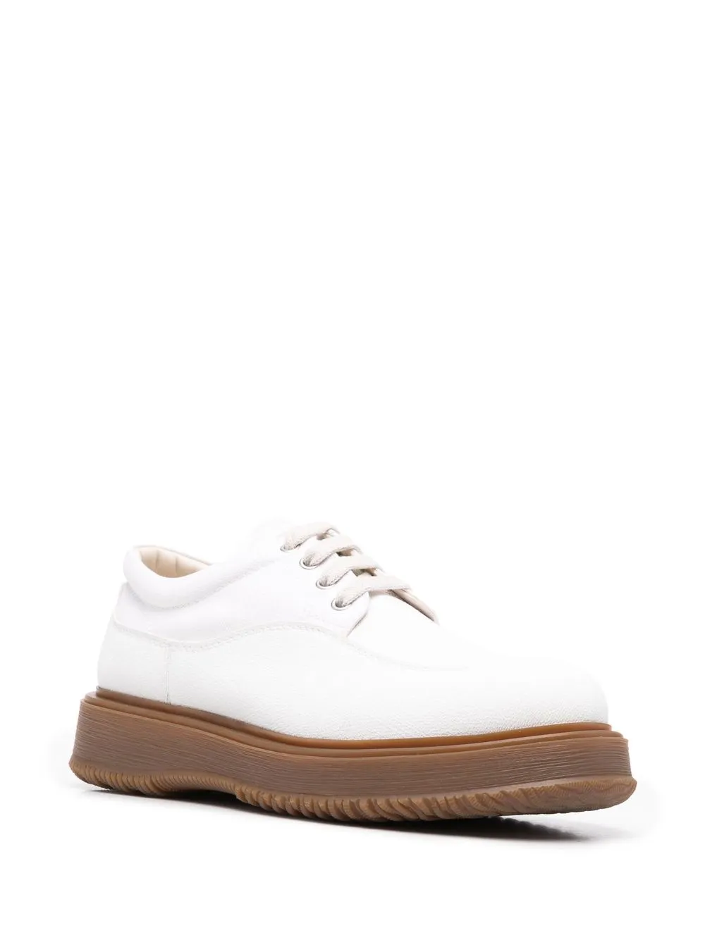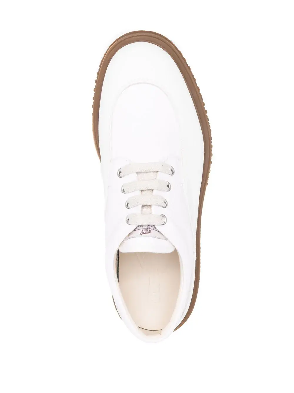 Белый, коричневый, кожа, хлопок, закругленный носок, шнуровка спереди, строчка в тон и массивная резиновая подошва.