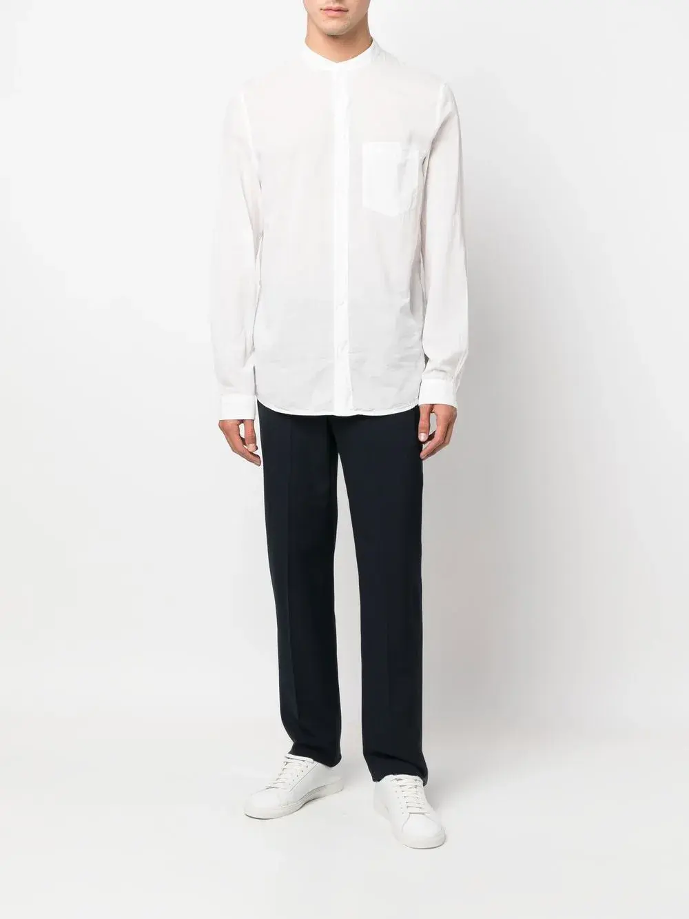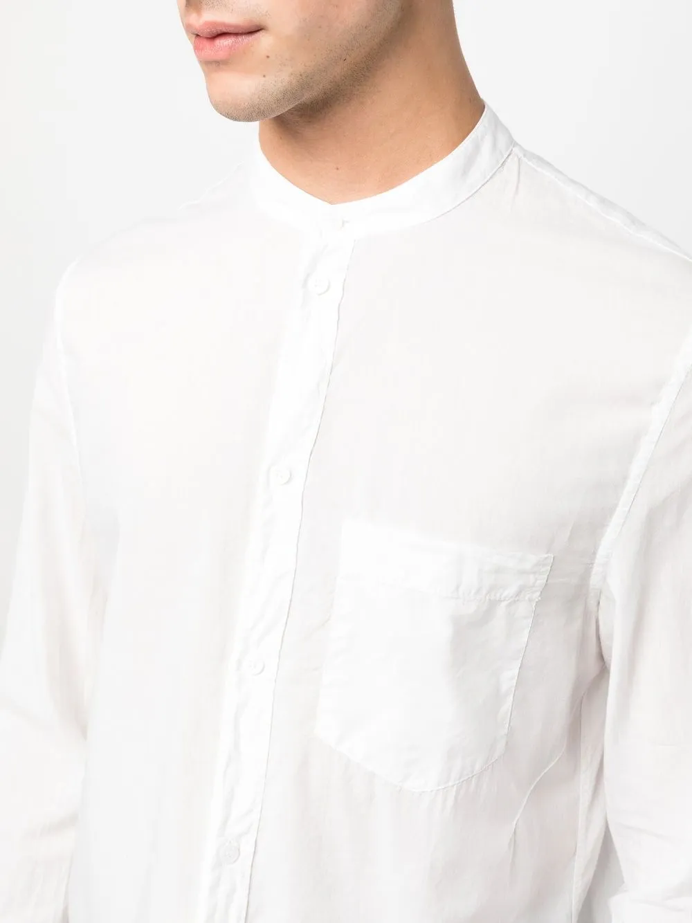 Белый, хлопок, воротник-стойка, застежка на пуговицах спереди, длинные рукава, манжеты на пуговицах и закругленный подол.
