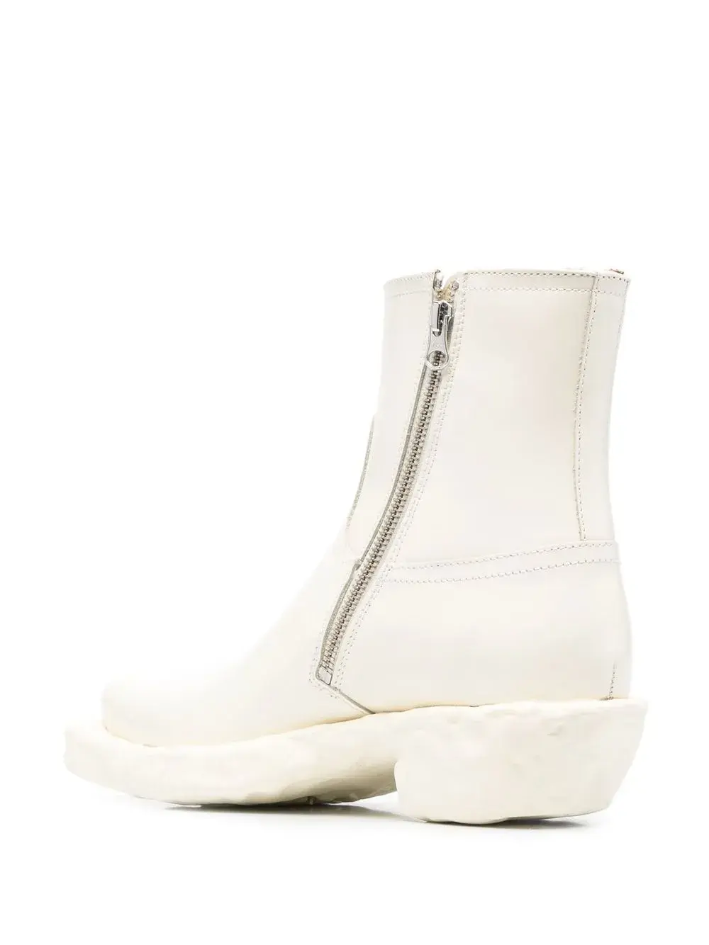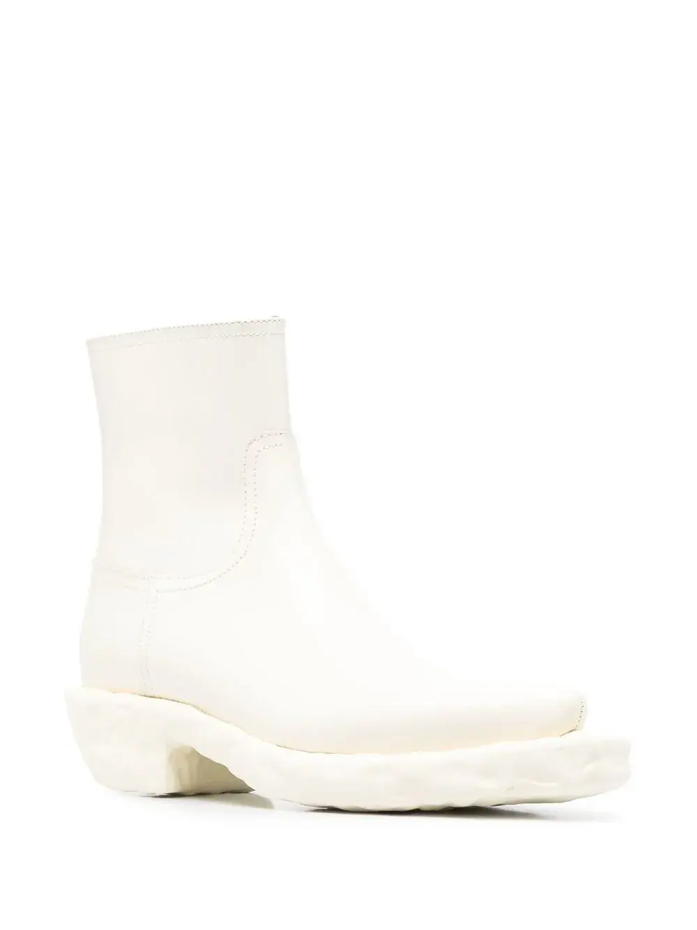 Белый, телячья кожа, строчка в тон, застежка на молнии сбоку, подошва на платформе, кубинский каблук, заостренный носок и высота по щиколотку.