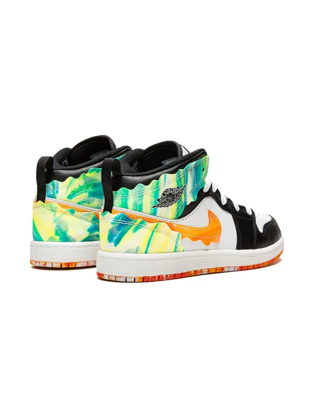 Черный, белый, оранжевый, кожа, вставки, абстрактный принт, логотип Air Jordan Wings, логотип Nike Swoosh, закругленный носок, шнуровка спереди, длина по щиколотку и резиновая подошва. Эта модель представлена на маркетплейсе, где можно найти самые редкие модели кроссовок, о которых мечтают коллекционеры и любители streetwear по всему миру.