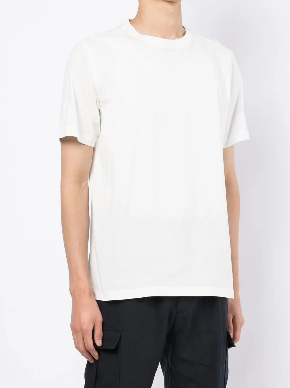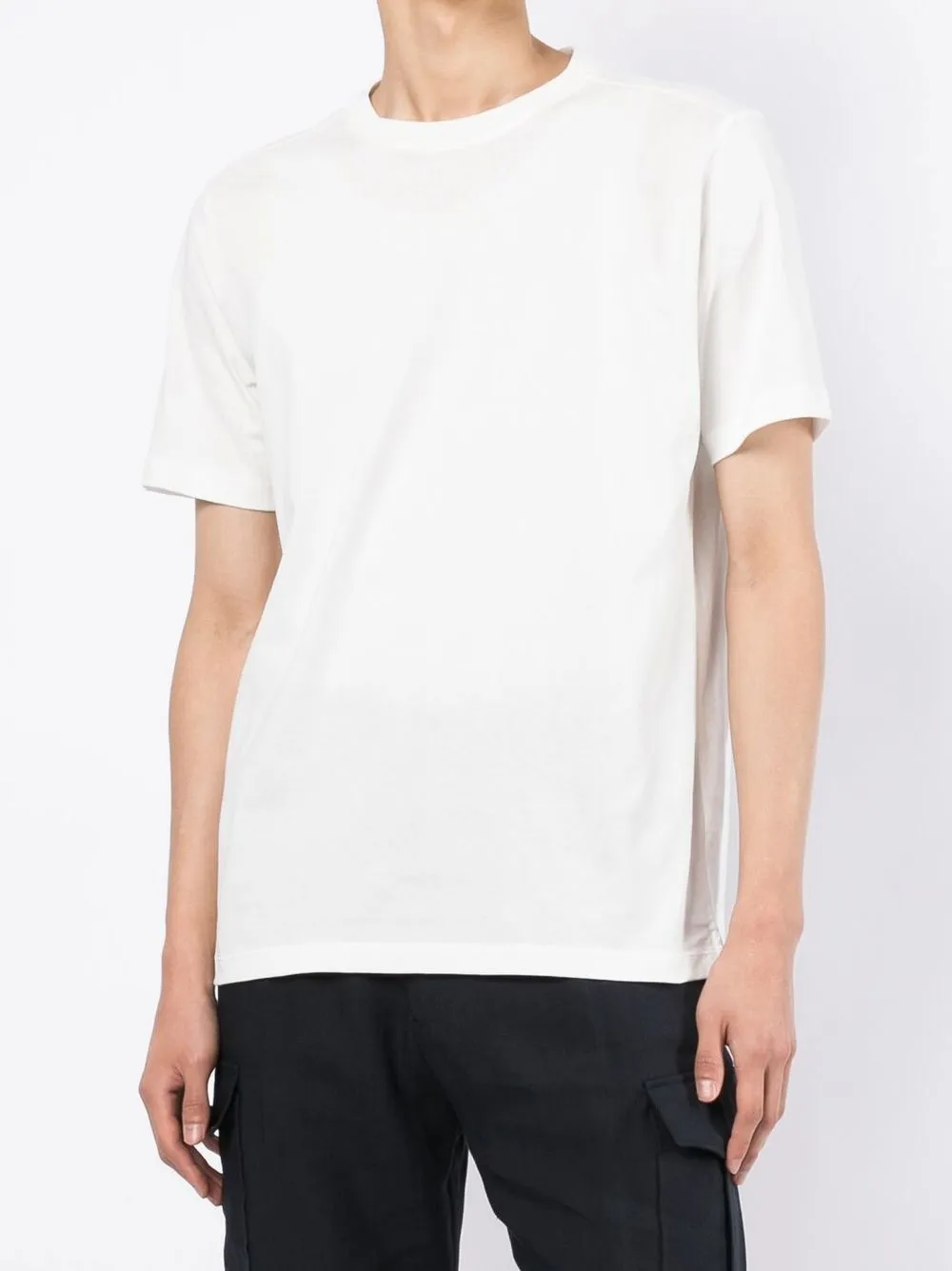 Графичный принт на спине, круглый вырез, короткие рукава и прямой подол.