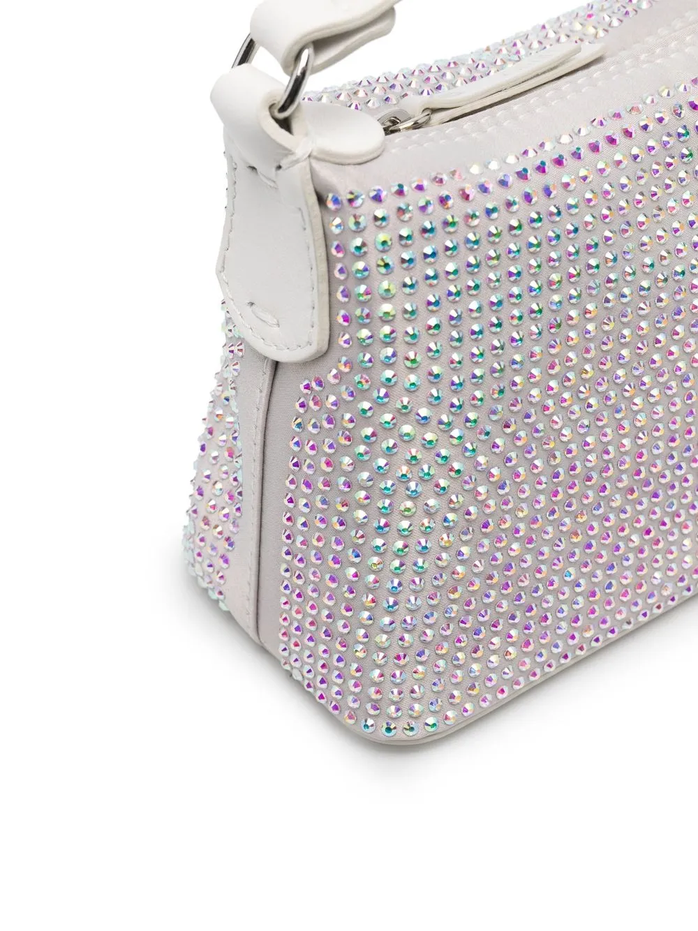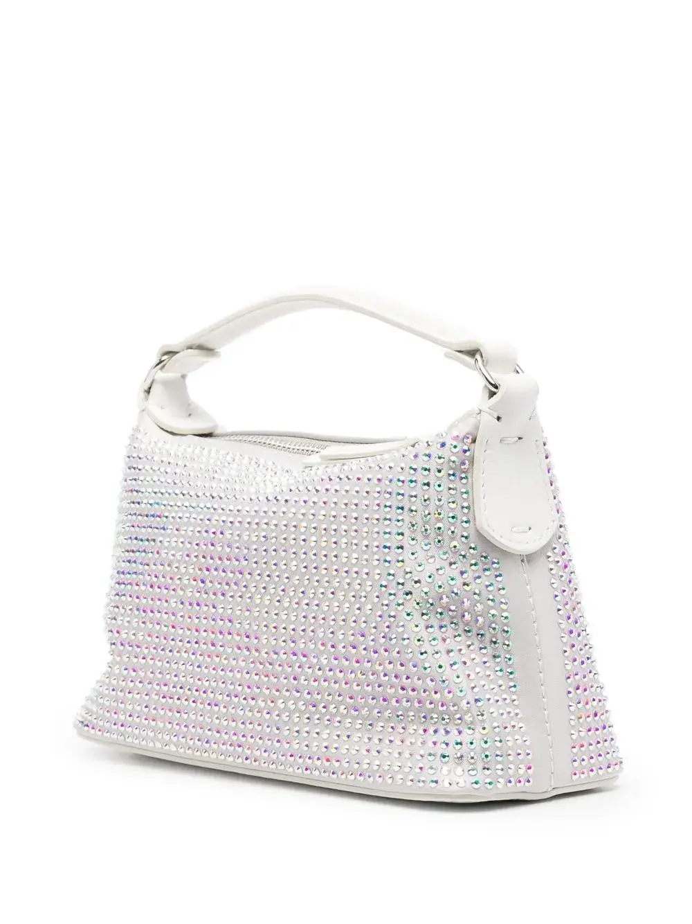 Белый, украшение из поделочных камней, застежка на молнии сверху, съемный регулируемый ремень на плечо и круглая верхняя ручка.