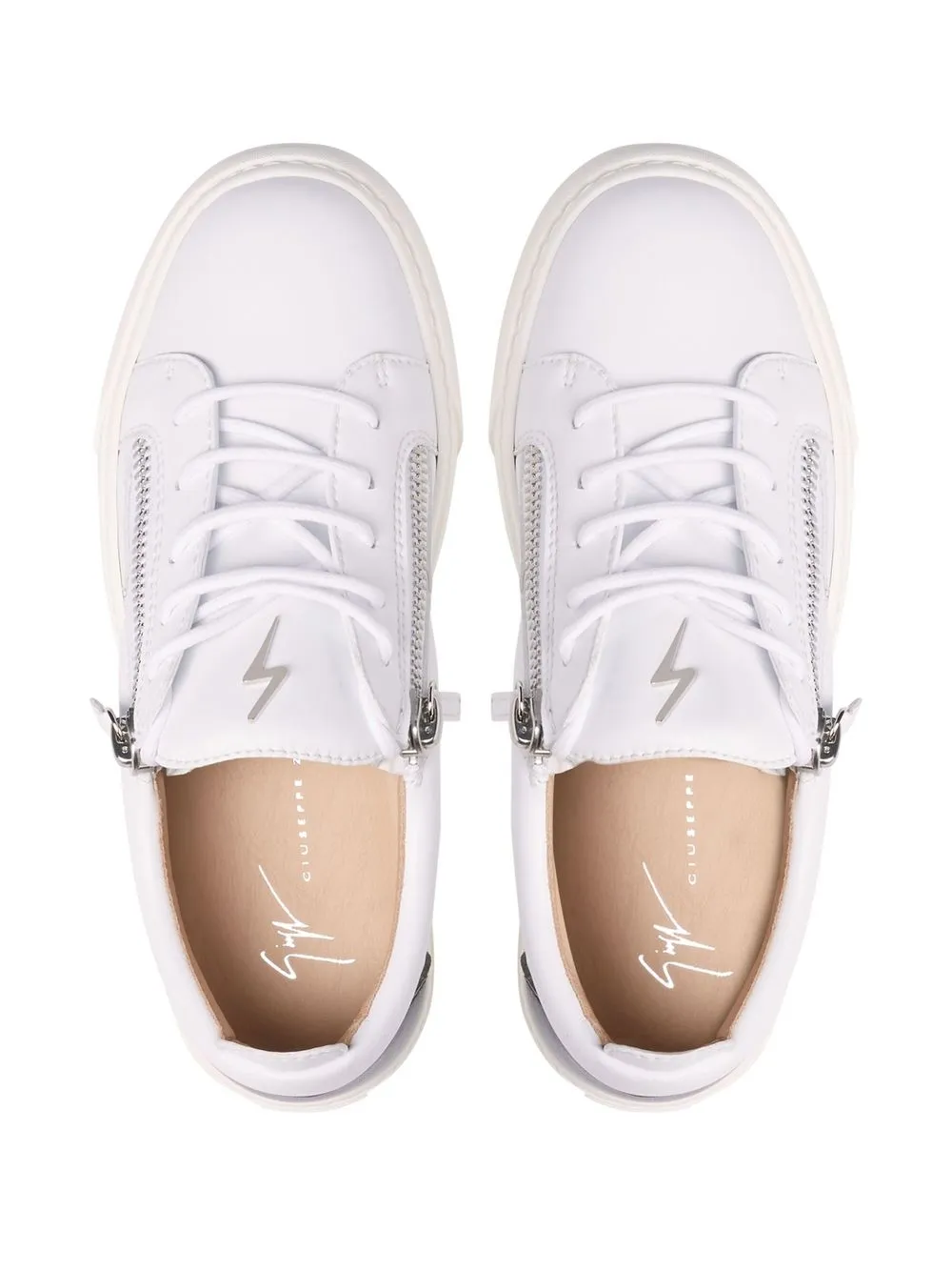 Белый, кожа, закругленный носок, шнуровка спереди, металлический логотип на язычке, отделка с декоративной молнией, стелька с логотипом, контрастный задник и плоская резиновая подошва.