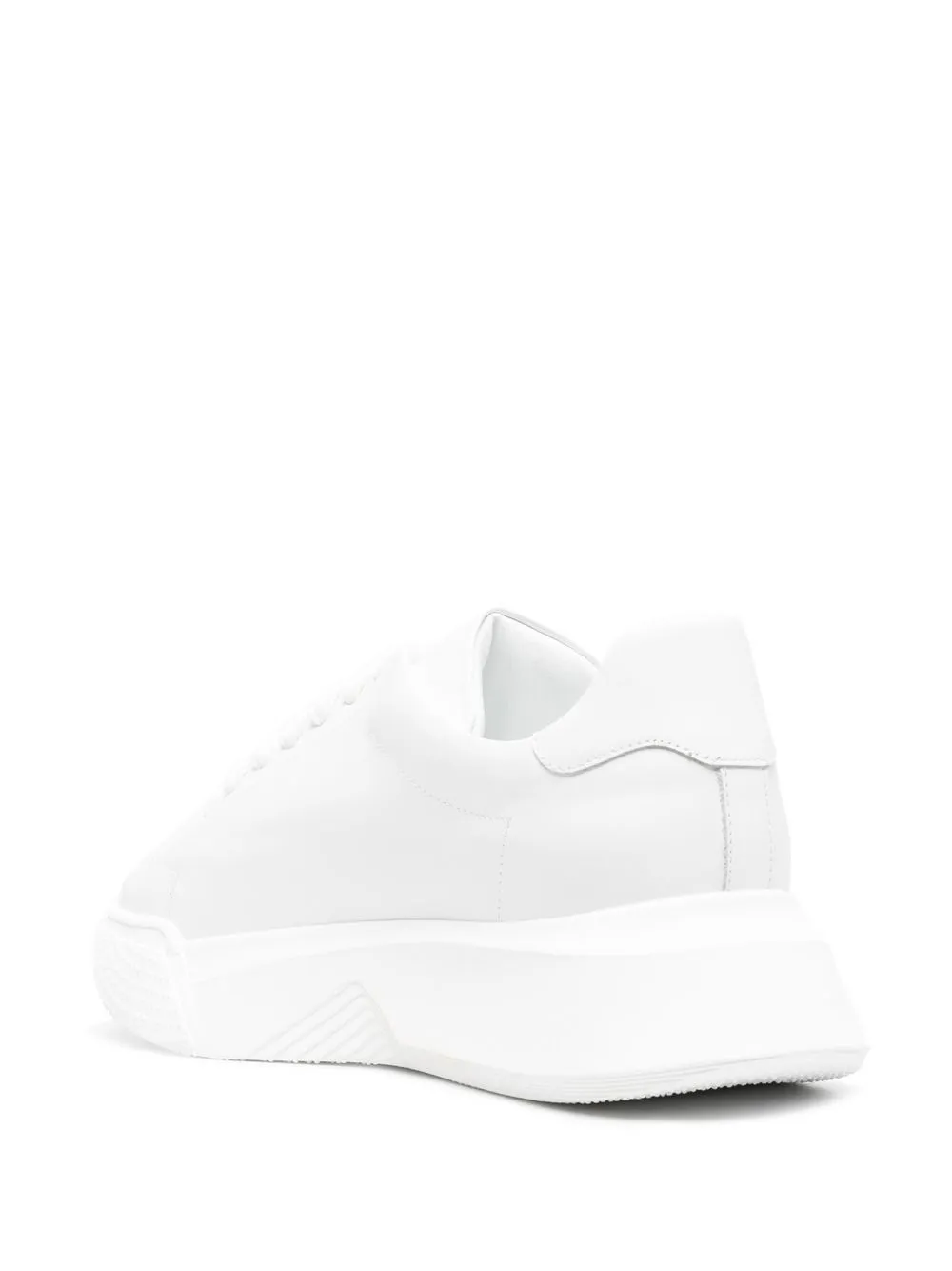Белый, телячья кожа, металлический логотип, закругленный носок, шнуровка спереди и плоская резиновая подошва.