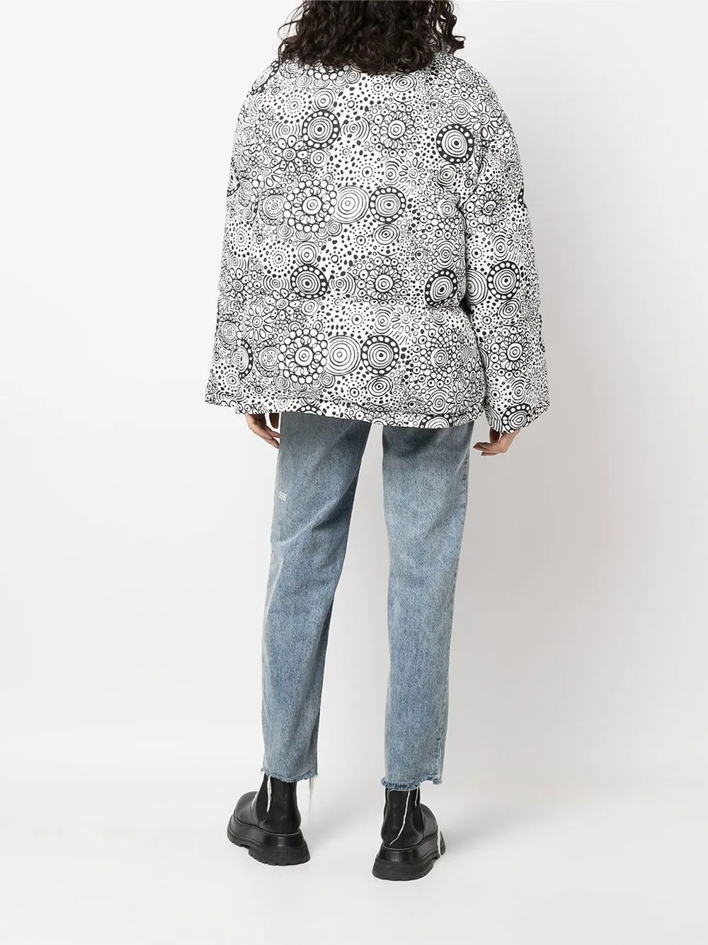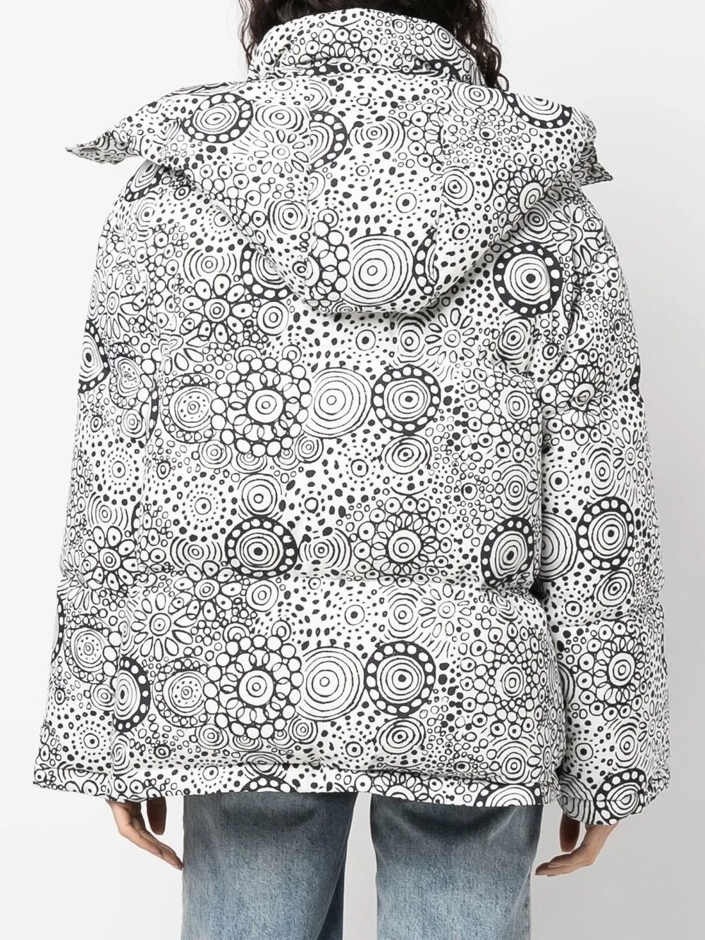 Черный, белый, наполнитель из смеси пуха и пера, абстрактный принт, воротник-стойка, длинные рукава и застежка на молнии спереди.