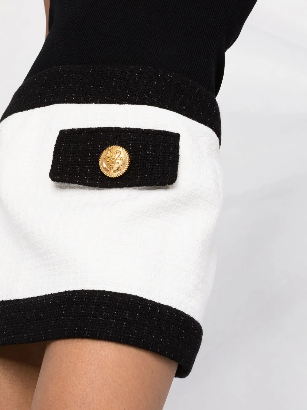 Черный/белый, смесовый хлопок, твидовая ткань, золотистые пуговицы с тиснением, низкая посадка, застежки на молнии сбоку, имитация кармана и прямой подол.