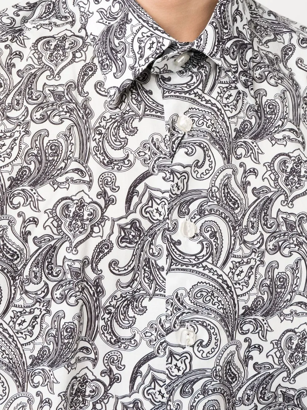 Кремовый, смесовый хлопок, принт пейсли, классический воротник, длинные рукава и планка на пуговицах спереди.