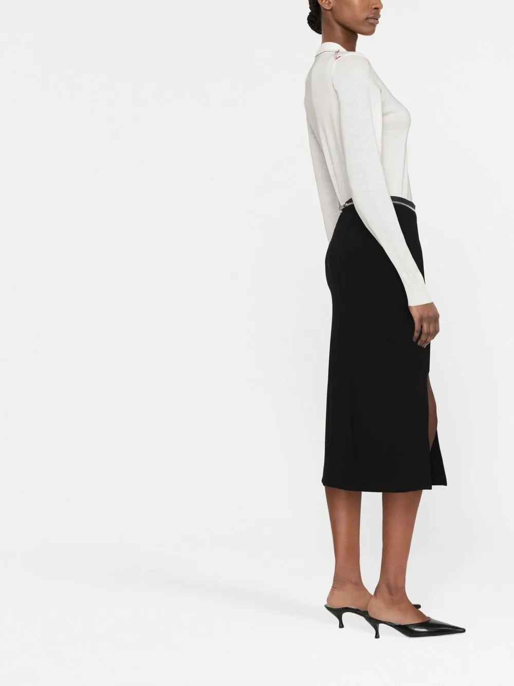 Цвет слоновой кости, шерсть, необработанные детали, трикотажный материал, круглый вырез, длинные рукава и прямой подол.