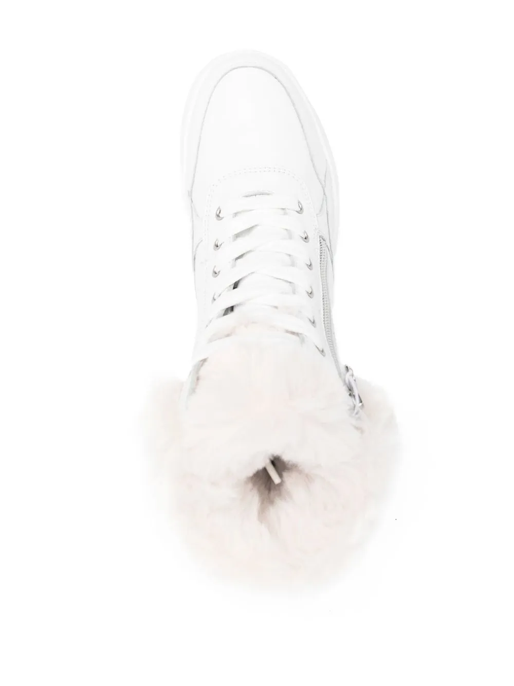 Белый, подкладка из овечьей шерсти, застежка на молнии спереди, закругленный носок, шнуровка спереди, серебристая фурнитура, высота по щиколотку и рифленая резиновая подошва.