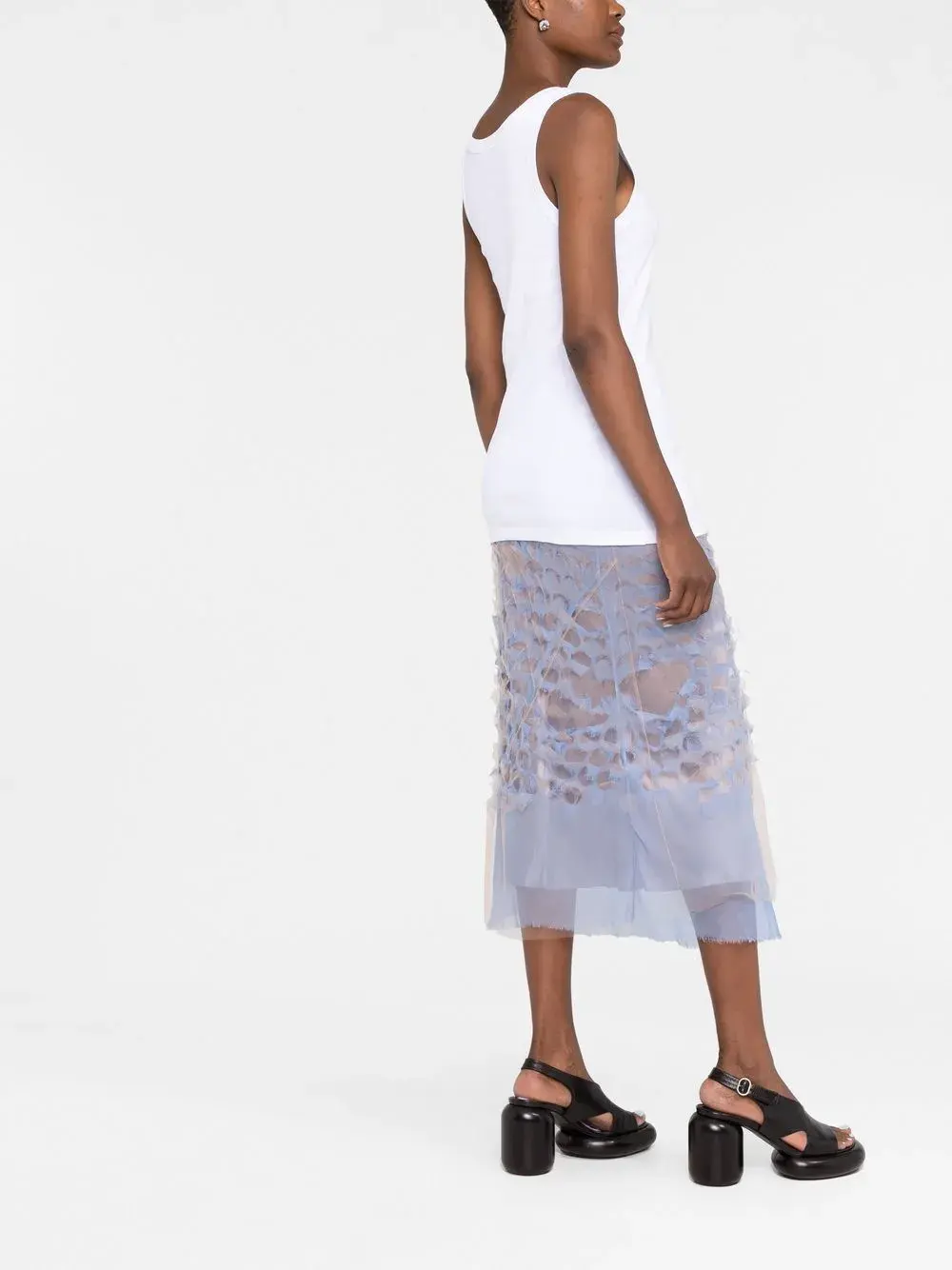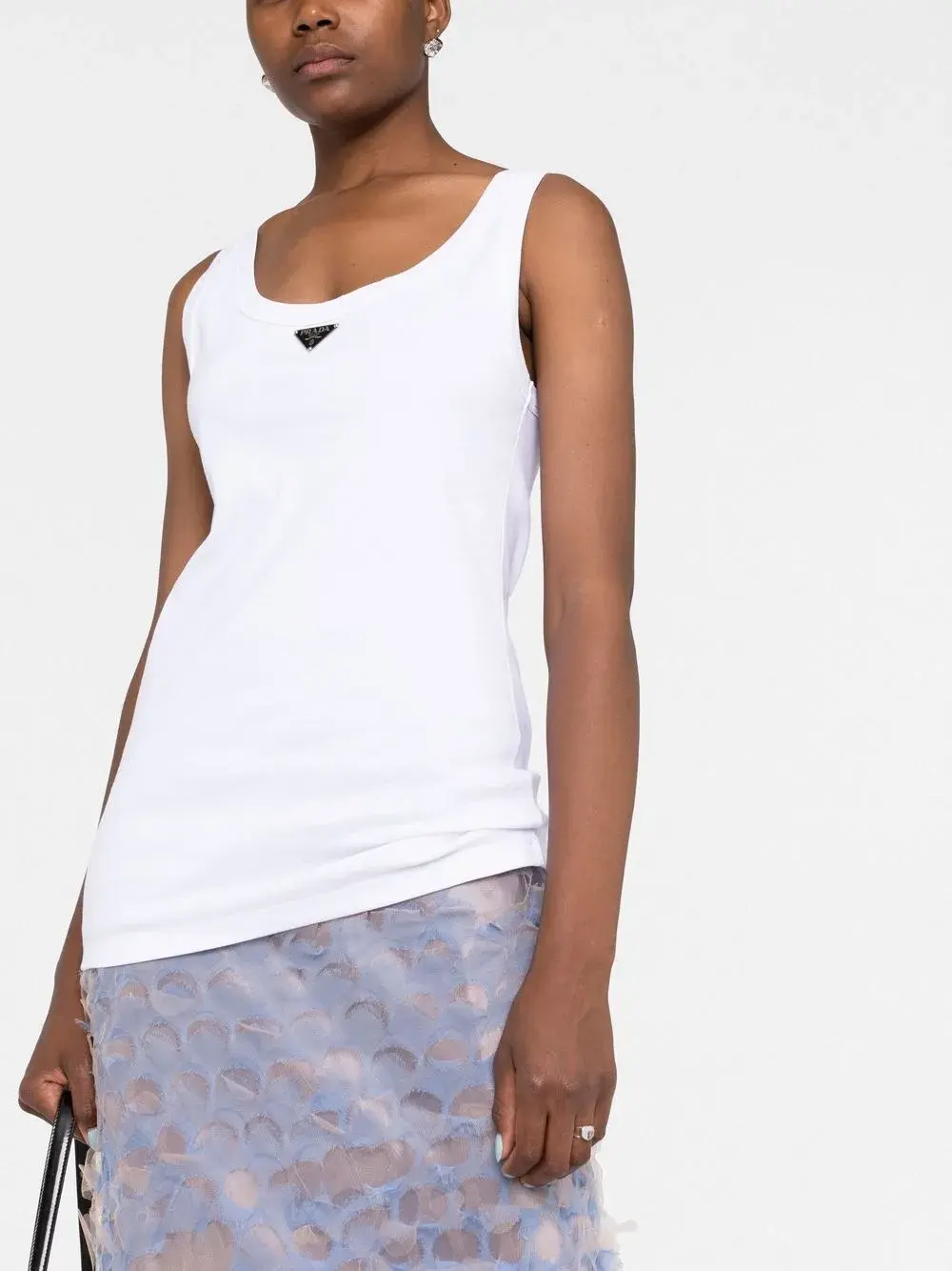 Белый, хлопок, треугольный эмалированный логотип, квадратный вырез, без рукавов и прямой подол.
