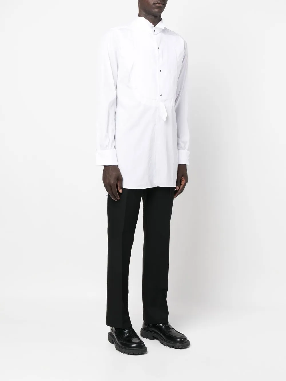 Белый, хлопок, воротник-бабочка, застежка на пуговицы, длинные рукава, длинная модель и рукава с манжетами на пуговицах.