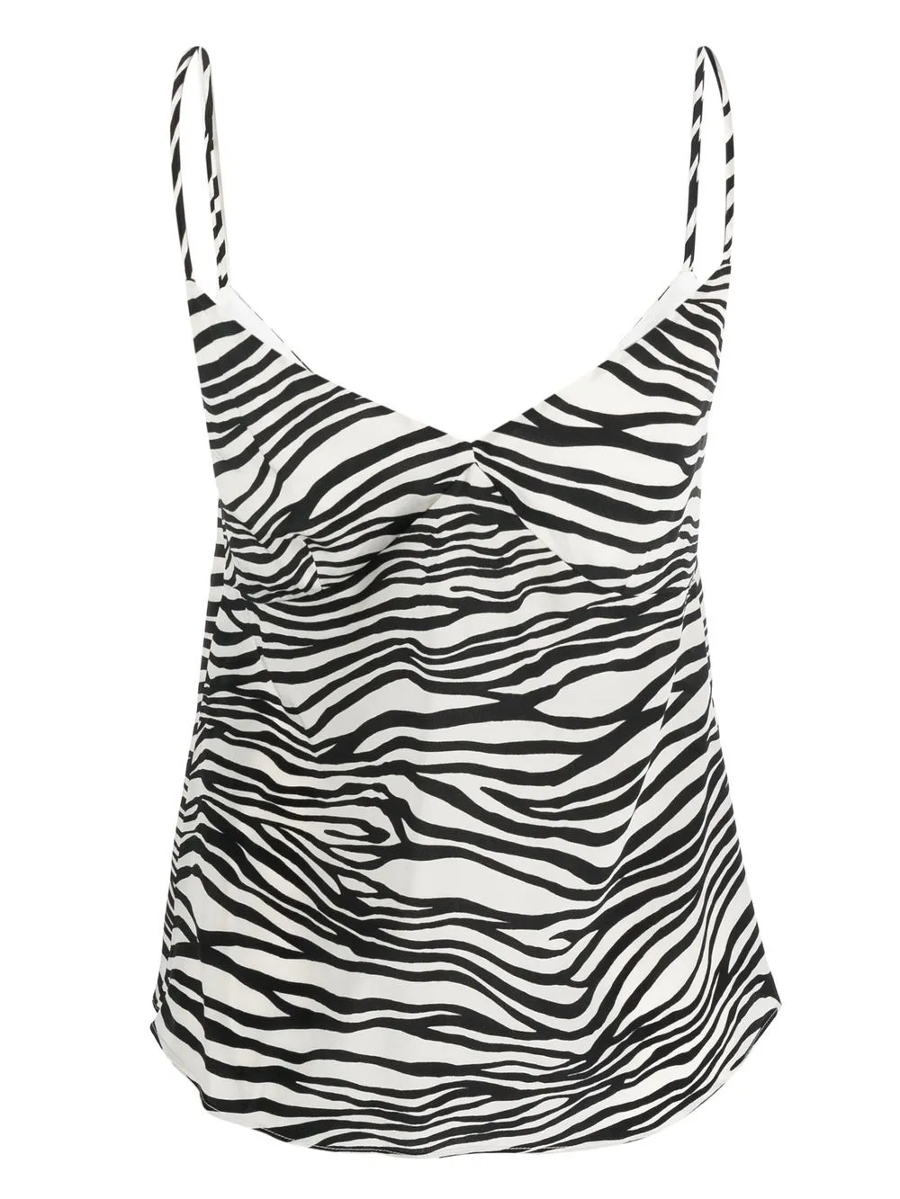 Белый/черный, смесовый шелк, зебровый принт, U-образный вырез, V-образный вырез сзади, тонкие бретели и закругленный подол.