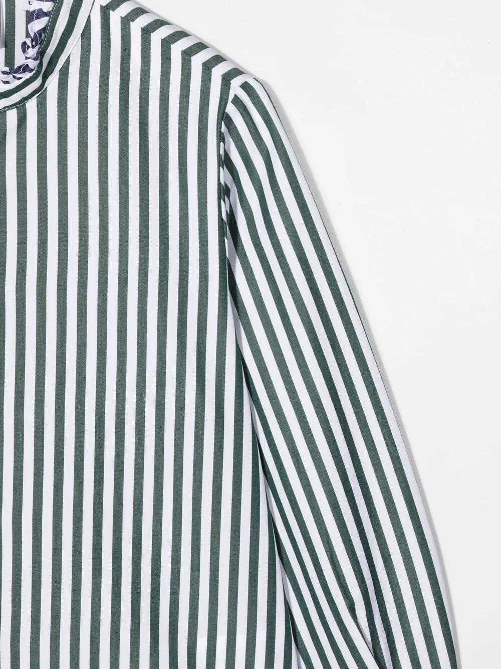 Темно-зеленый, кремовый, хлопок, принт в вертикальную полоску, воротник с оборками, застежка на пуговицах спереди, длинные рукава, манжеты на пуговицах и закругленный подол.