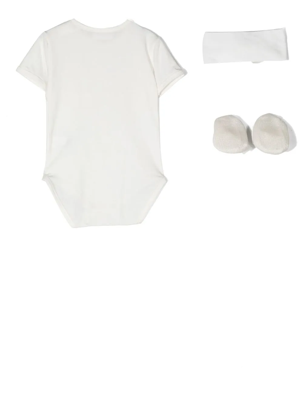 Ткань джерси, вставки с оборками, украшения из горного хрусталя, пуговичные застежки на плечах, круглый вырез, короткие рукава и пинетки.