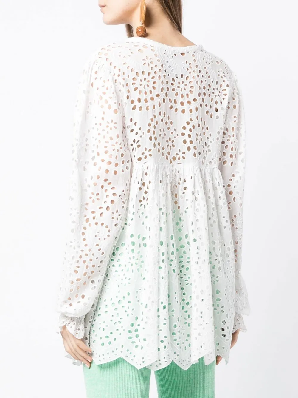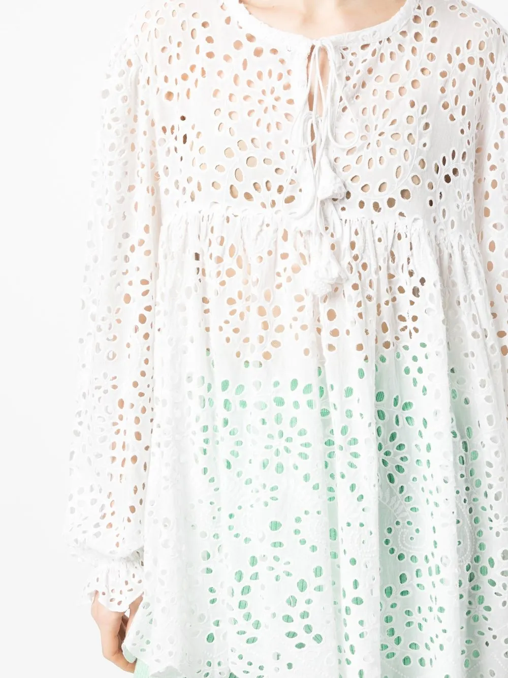 Белый, кроше, расклешенный крой, круглый вырез и длинные рукава.
