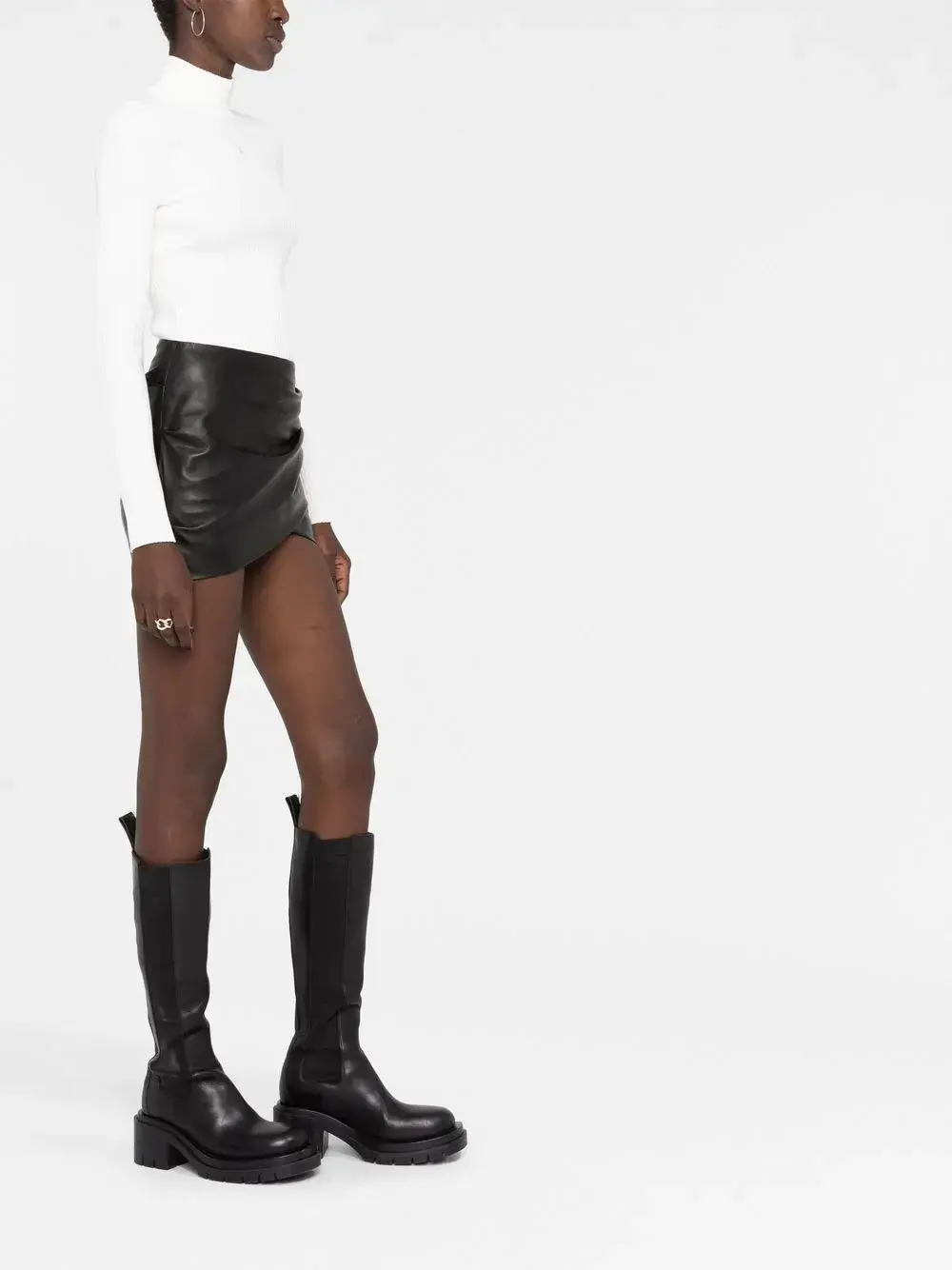 Белый, трикотаж в рубчик, воротник-труба и длинные рукава.