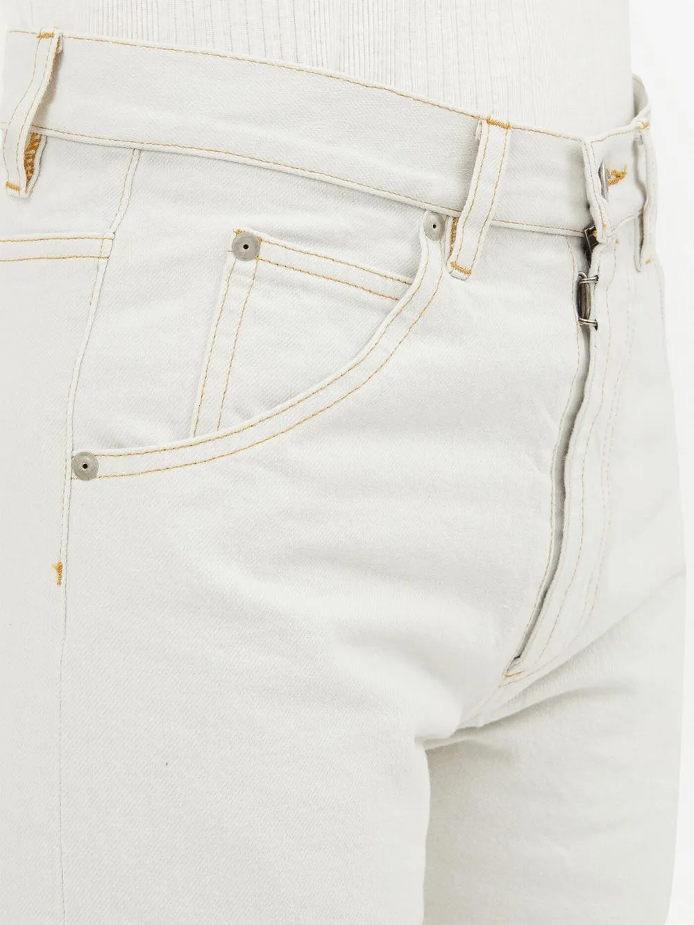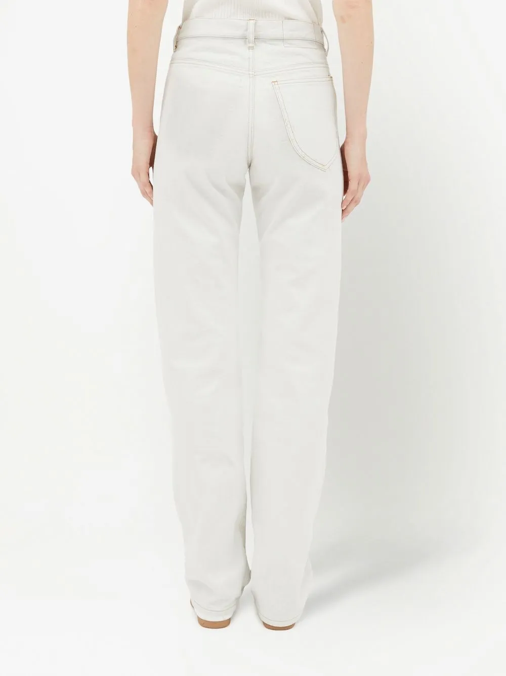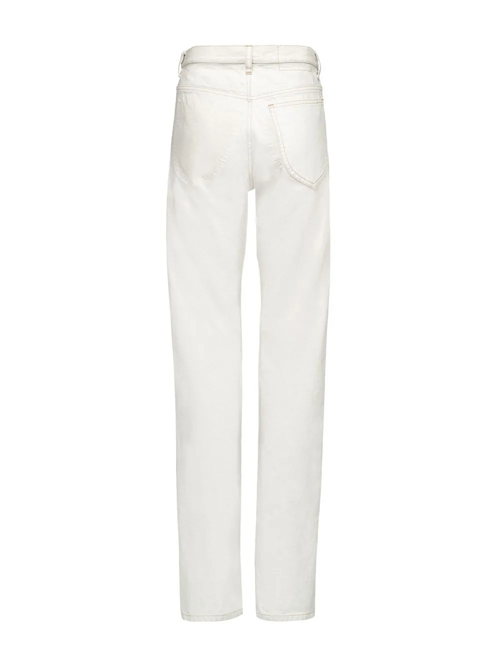 Белый, хлопок, деним, завышенная талия, прямой крой, петли для ремня, застежка на молнии и пуговице спереди, пять карманов и прямой крой.