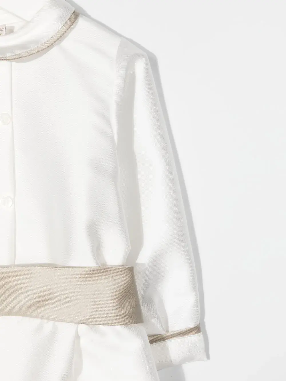 Белый, коричневый, хлопок, контрастная отделка, классический воротник, декоративные пуговицы в два ряда, застежка на пуговицы сзади, длинные рукава и прямой крой.