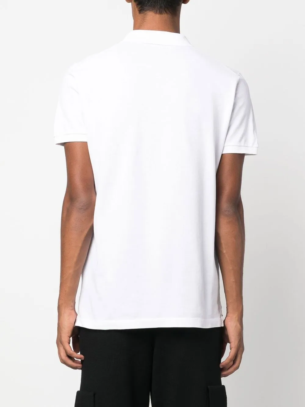 Белый, хлопок, принт с логотипом на груди, классический воротник, планка на пуговицах спереди и короткие рукава.