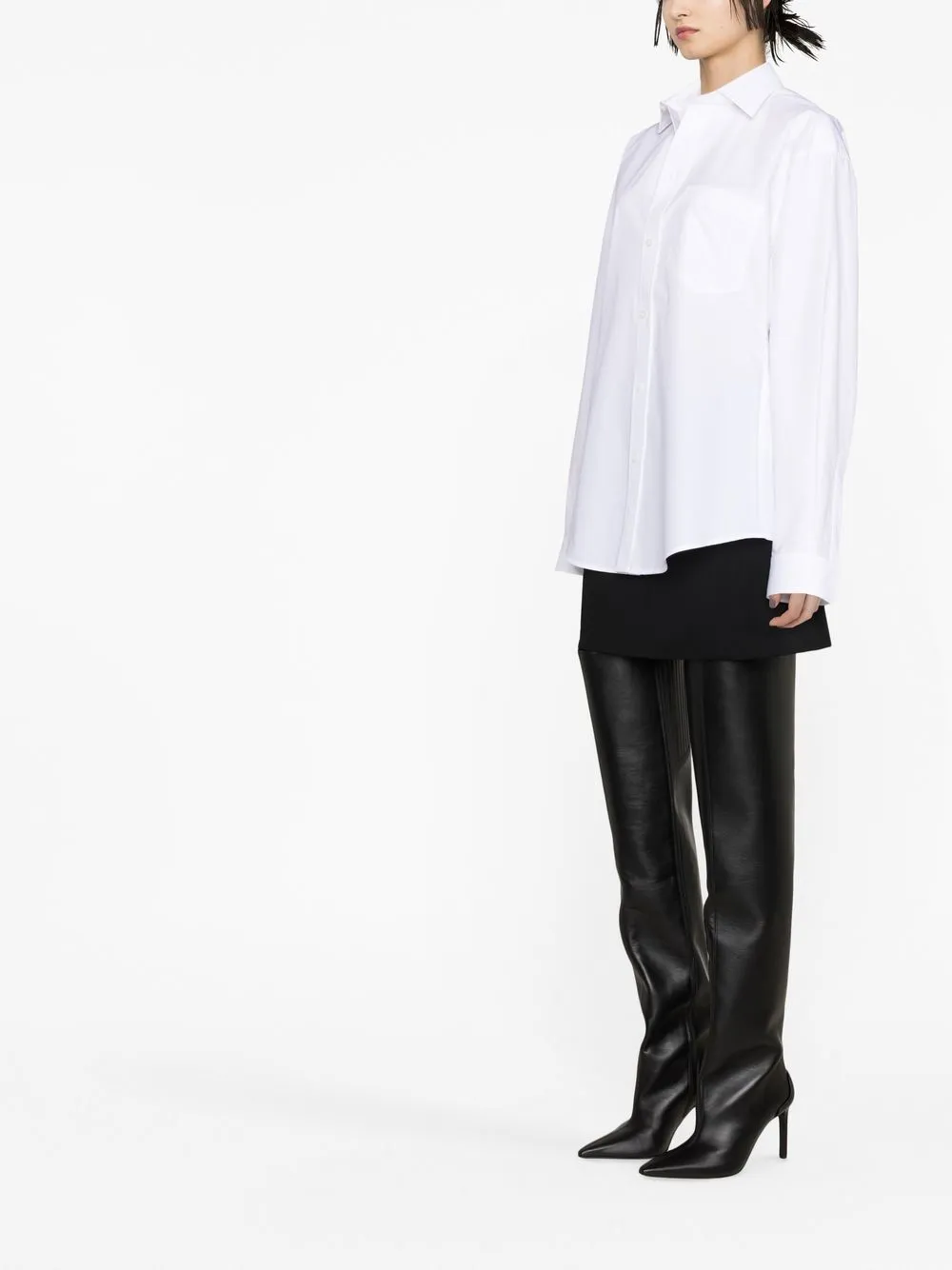 Белый, хлопок, силуэт «песочные часы», классический воротник, застежка на пуговицах спереди, карман-муфта, манжеты на пуговицах и закругленный подол.