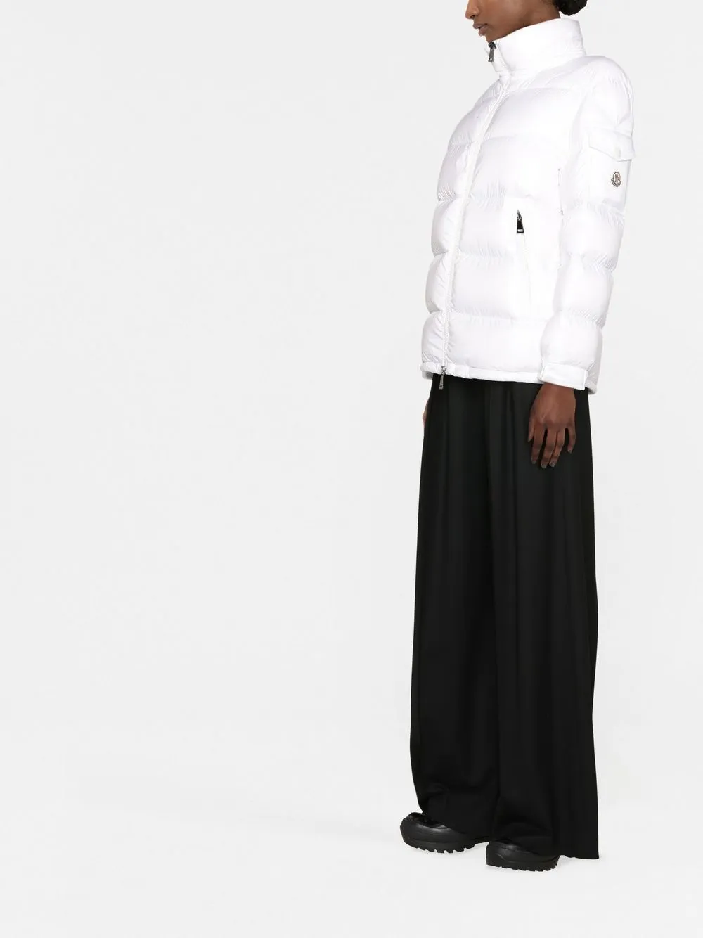 Белый, наполнитель из пуха и перьев, стеганая модель, дутый материал, застежка на молнии спереди, классический капюшон, два кармана на молнии по бокам, манжеты на пуговицах, карман с клапаном на рукаве и нашивка с логотипом на рукаве.