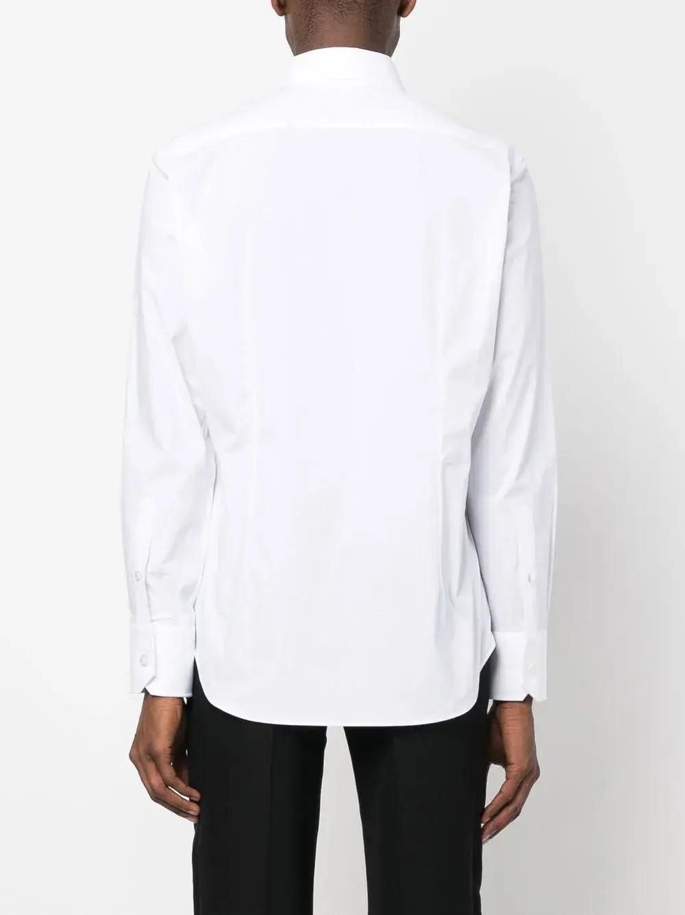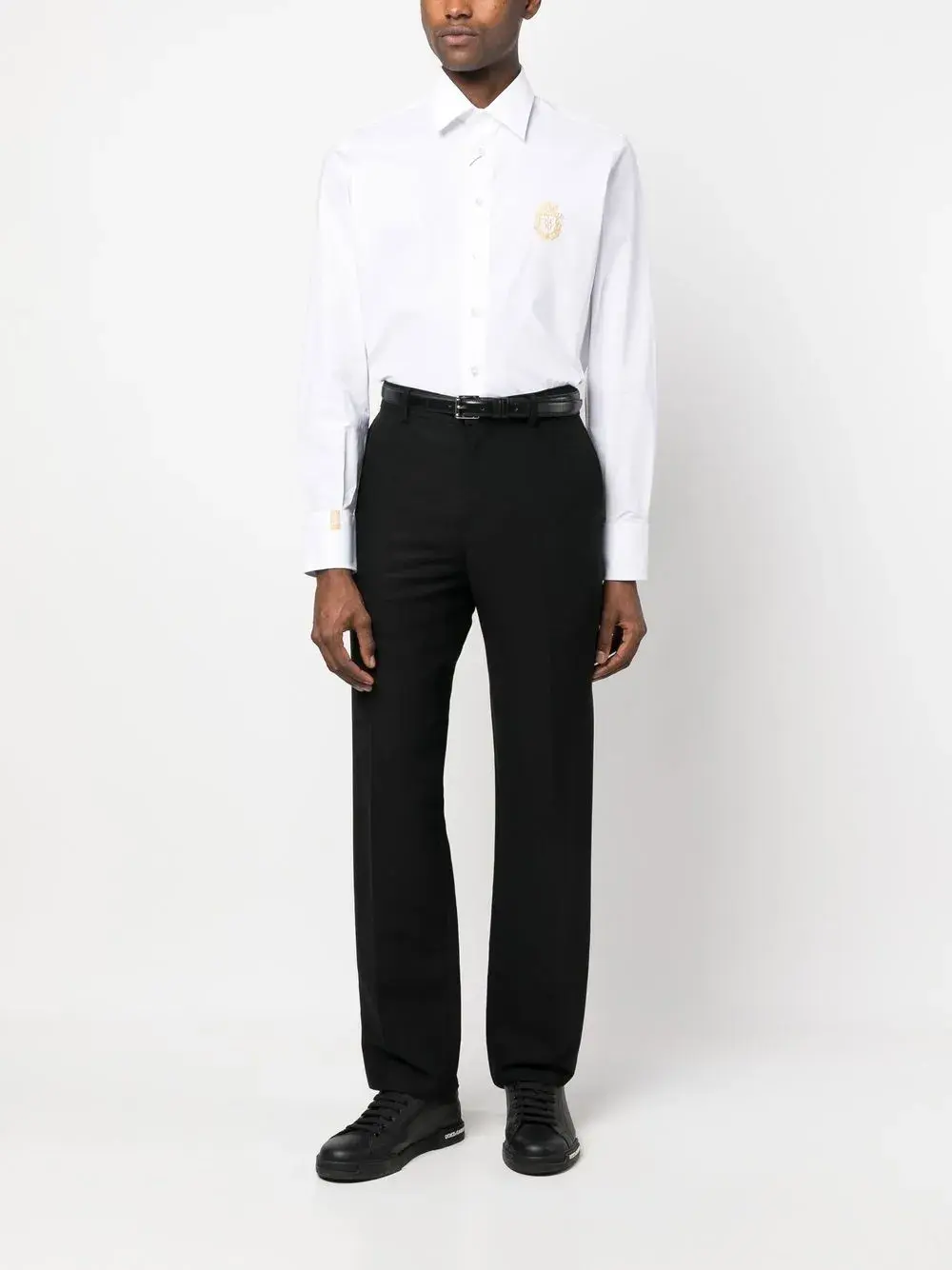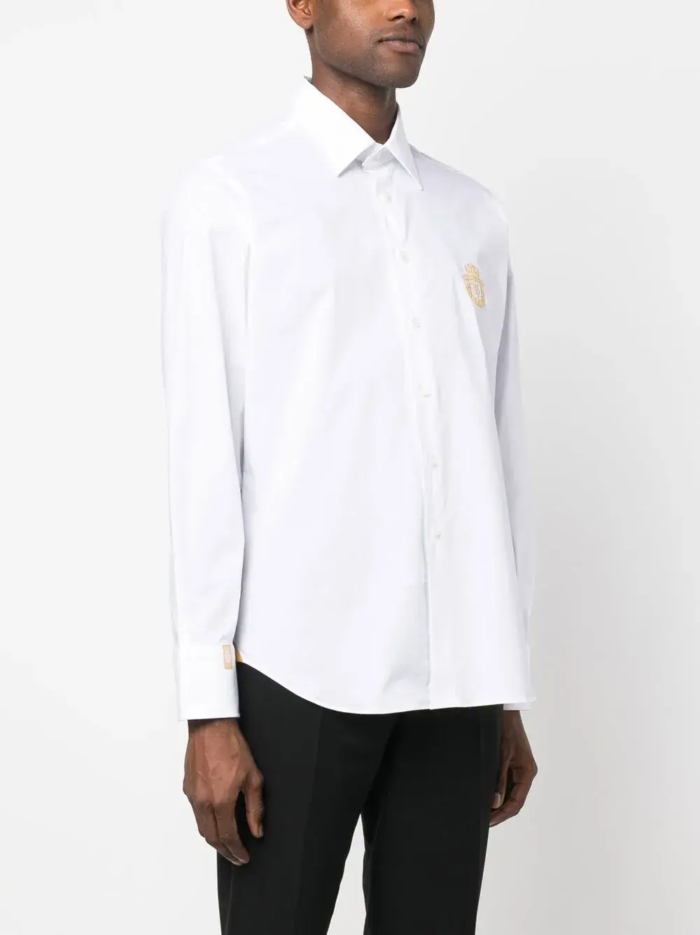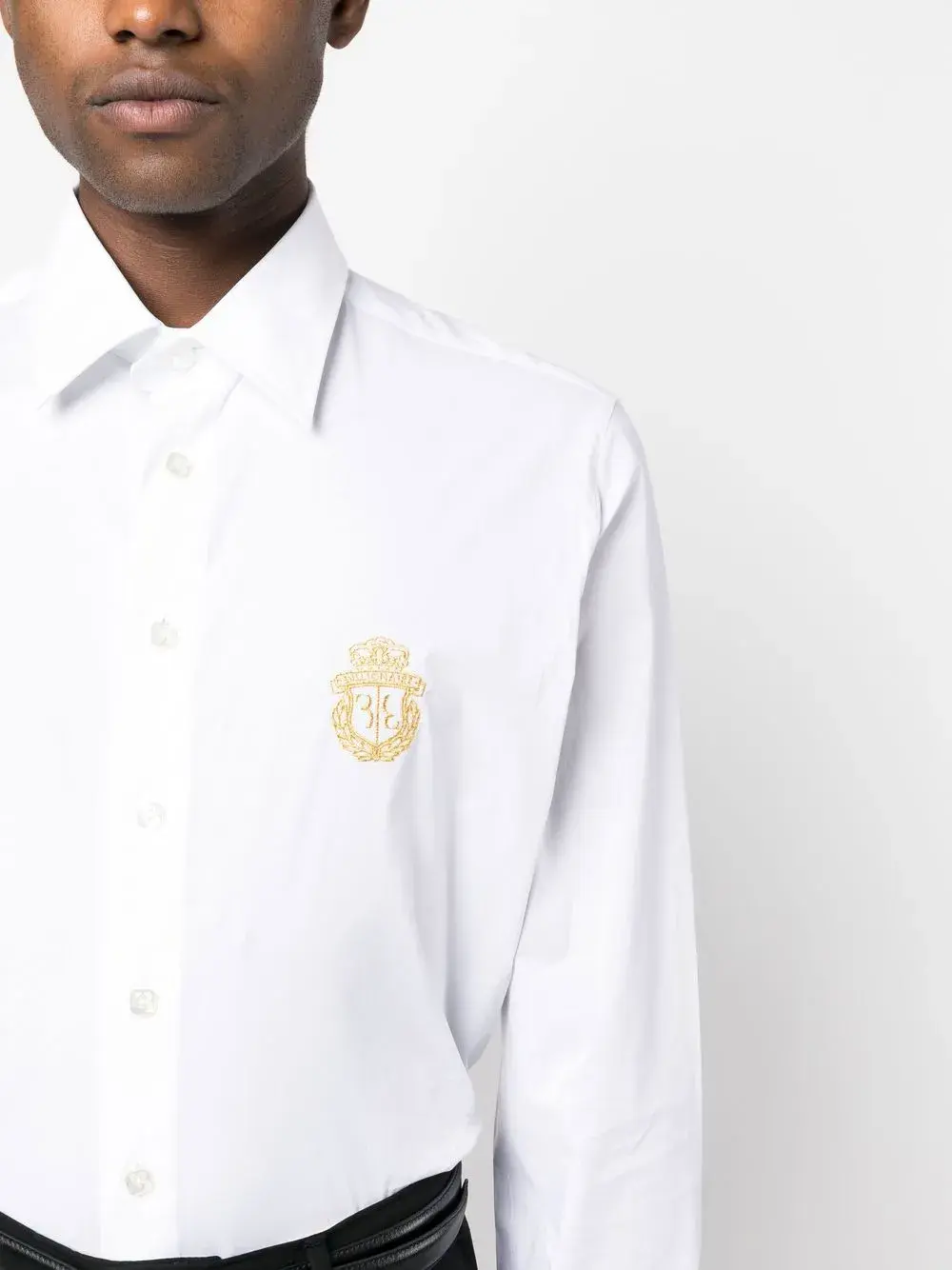 Белый, золотистый, эластичный хлопок, вышитый логотип на груди, классический воротник, застежка на пуговицах спереди, длинные рукава и закругленный подол.