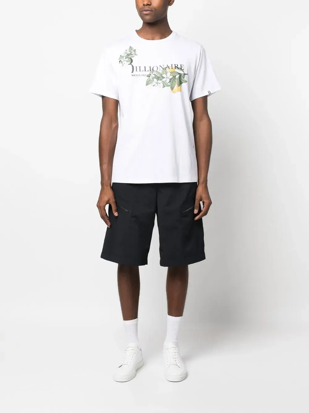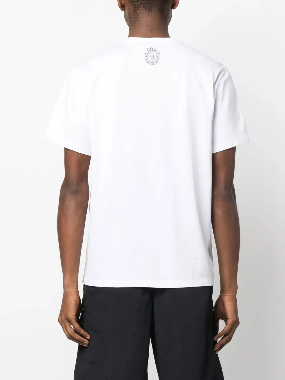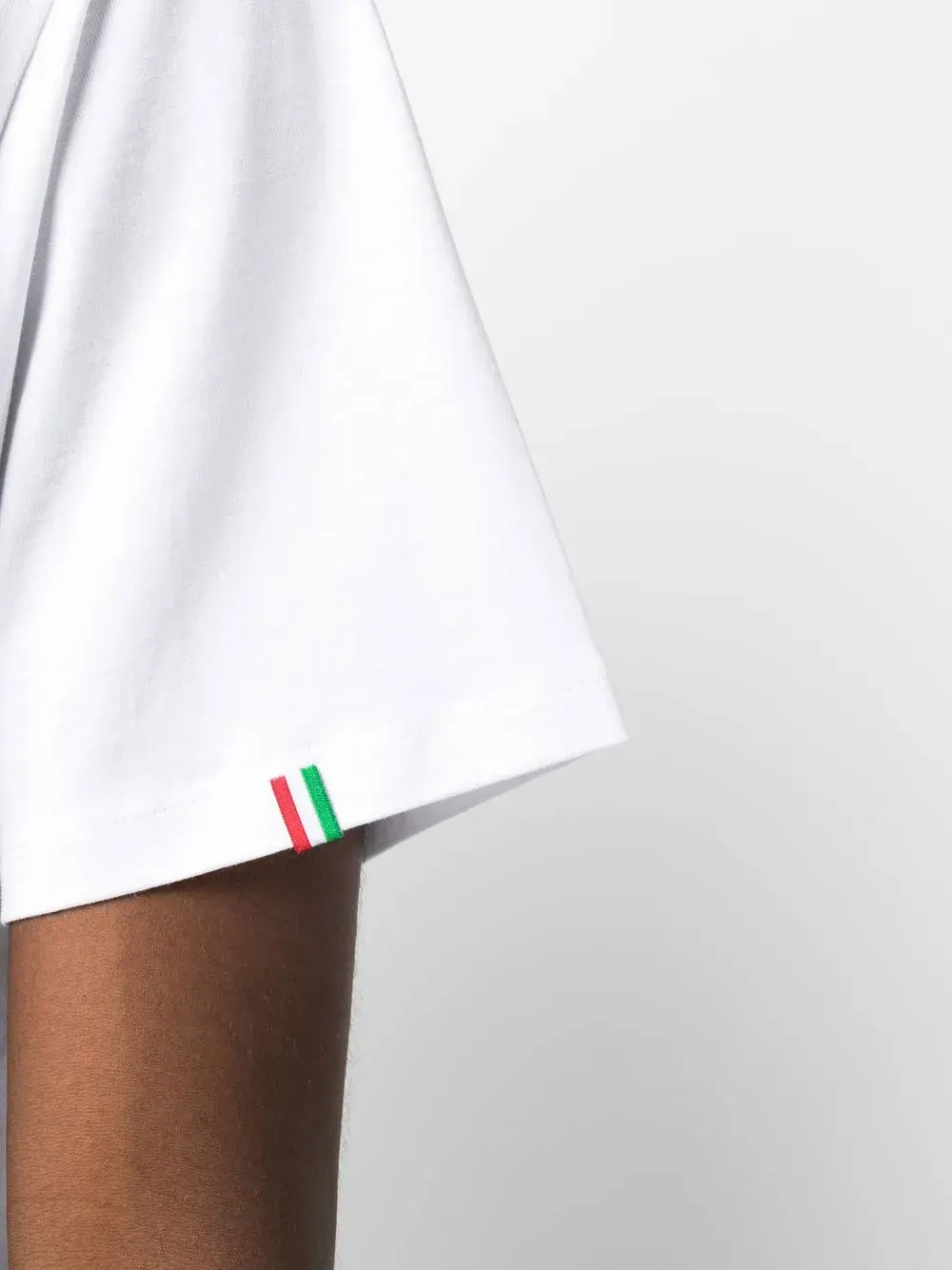 Белый, хлопок, принт с логотипом на груди, круглый вырез, короткие рукава и прямой подол.