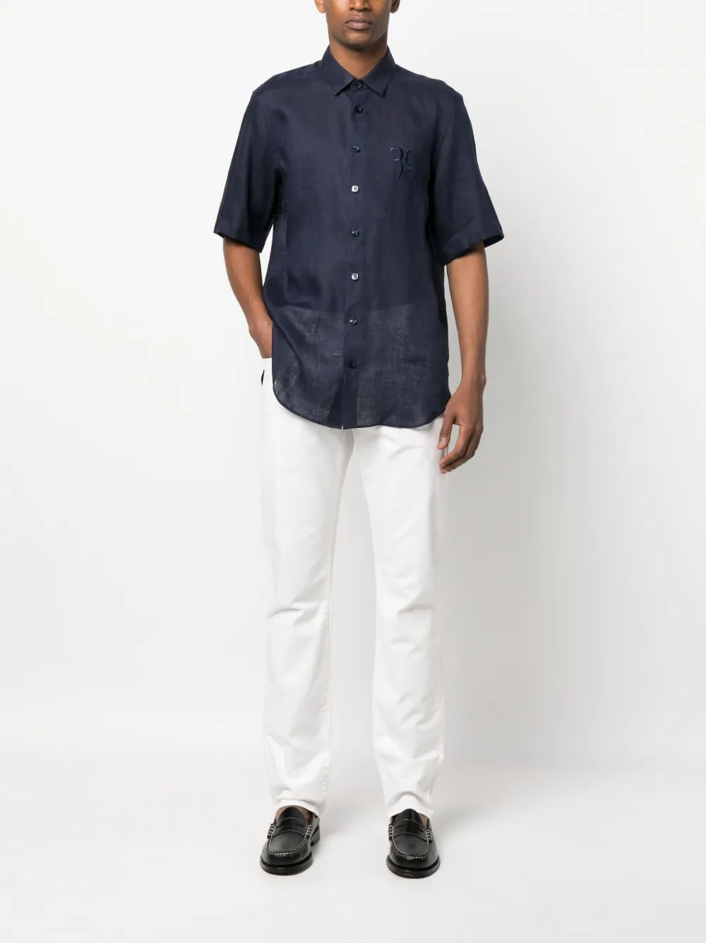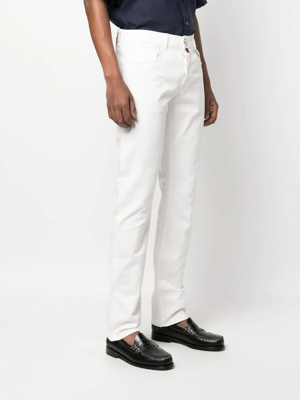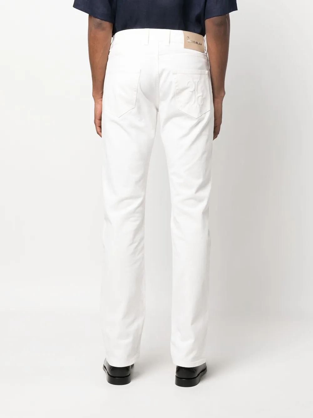 Белый, эластичный хлопок, вышитый логотип сзади, средняя посадка, петли для ремня, ширинка на пуговицах, пять карманов, нашивка с логотипом сзади и прямой крой.