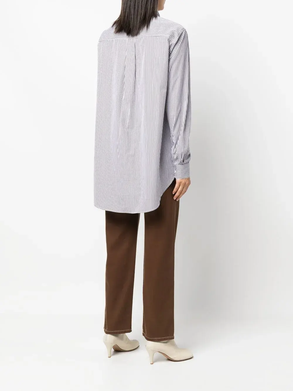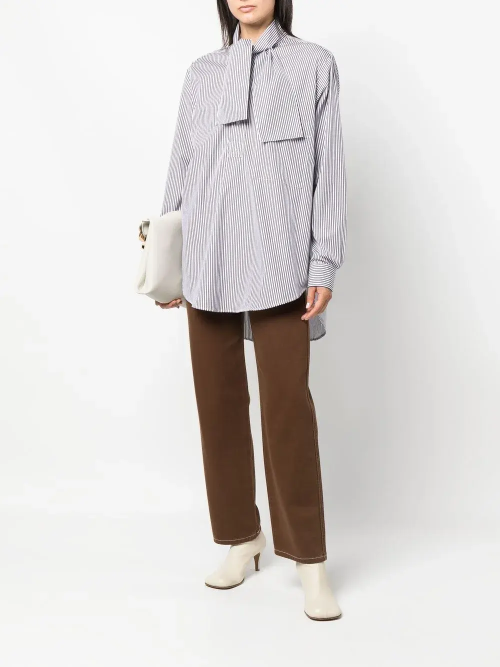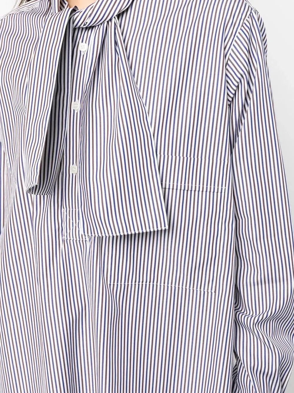Синий, хлопок, поплин, узор в полоску, присборенный воротник с завязками, застежка на пуговицах спереди, длинные рукава и закругленный подол.