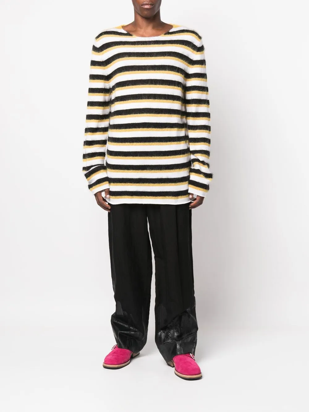 Желтый, черный/белый, смесовая необработанная шерсть, трикотажный материал, матовое покрытие, узор в горизонтальную полоску, высокий воротник, съемный воротник, оправа оверсайз, длинные рукава и прямой подол.