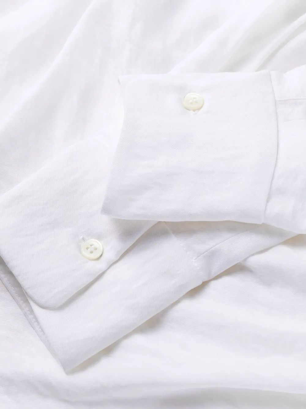 Белый, отложной воротник, глубокий V-образный вырез, застежка на пуговицах спереди, длинные рукава, манжеты на пуговицах, драпировка и длина до бедер.