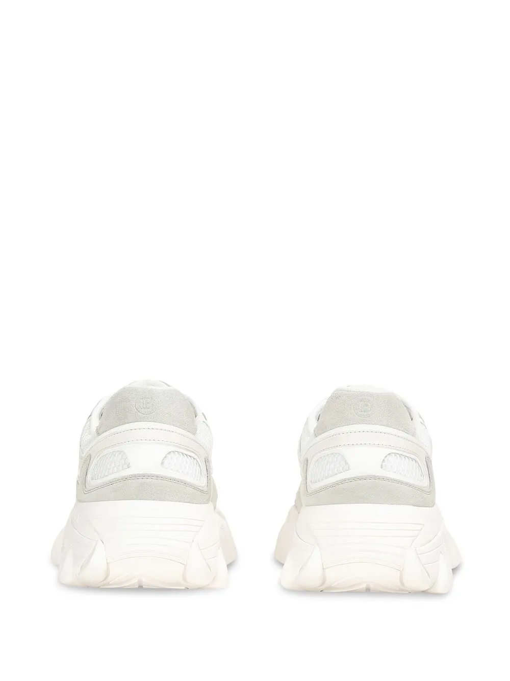 Белый, телячья кожа, вставки, сетка, тисненый логотип на язычке, задник с логотипом, закругленный носок, шнуровка спереди и массивная резиновая подошва.