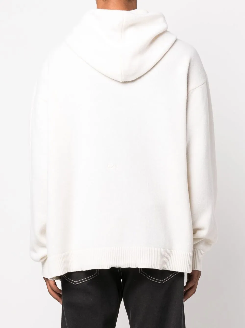 Белый, смесовая шерсть, трикотажный материал, застежка на молнии спереди, классический капюшон, два передних кармана, приспущенные плечи, длинные рукава и прямой подол.
