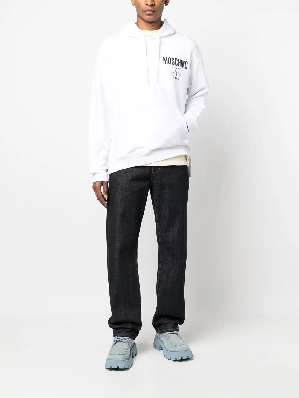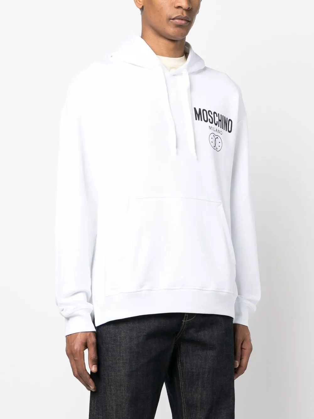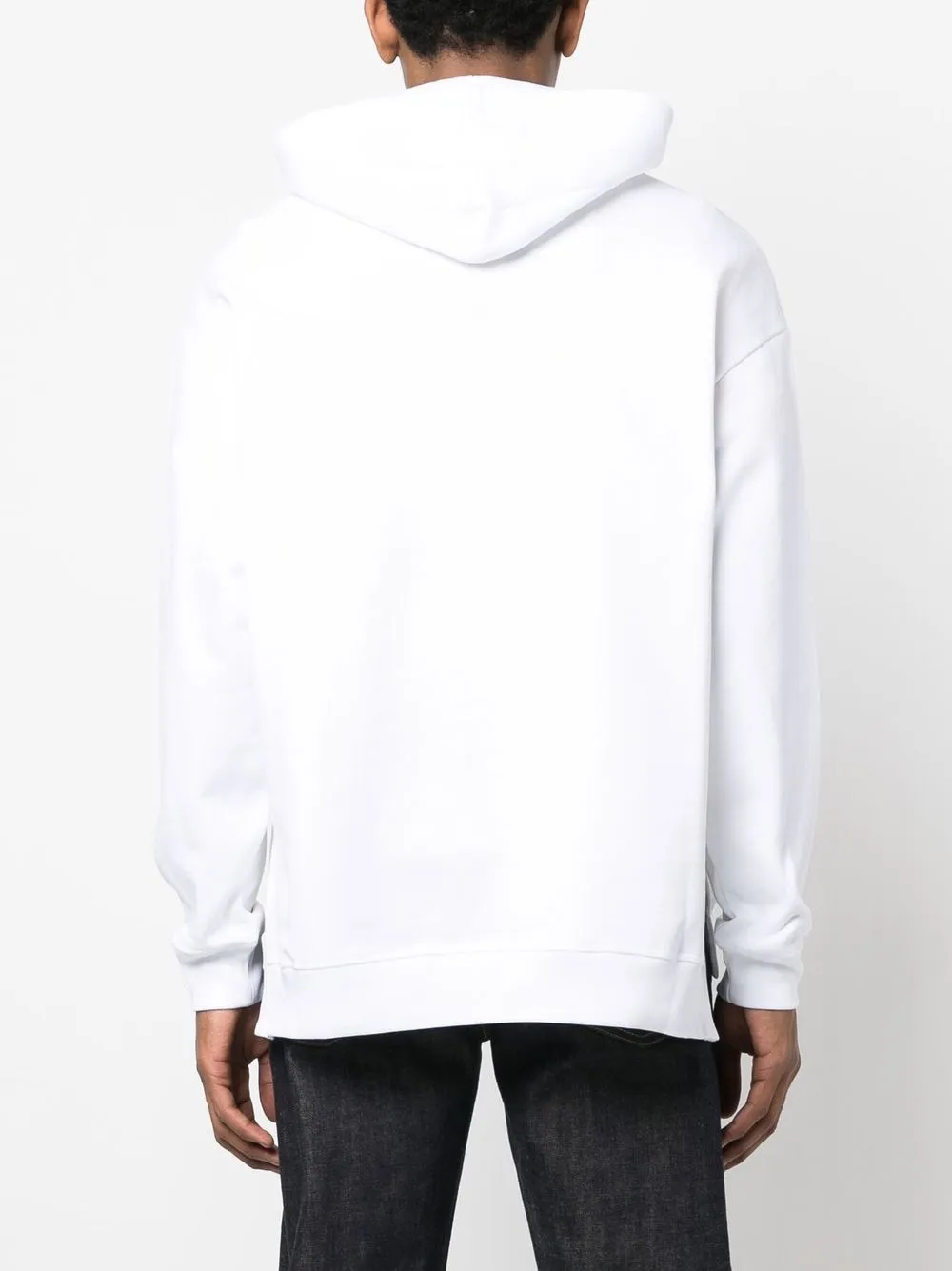 Белый, хлопок, принт с логотипом на груди, затягивающийся на шнурок капюшон, карман-муфта, длинные рукава, эластичные манжеты и эластичный подол.