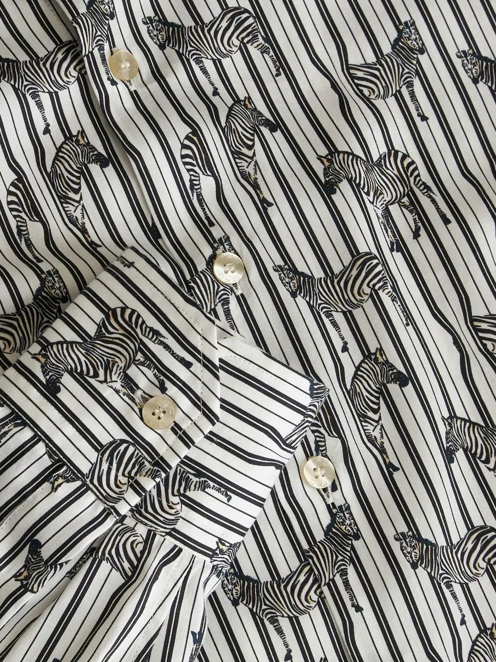 Черный/белый, смесовый хлопок, принт в вертикальную полоску, зебровый принт, классический воротник, застежка на пуговицах спереди, длинные рукава, манжеты на пуговицах и закругленный подол.