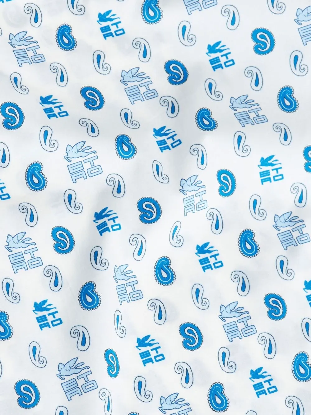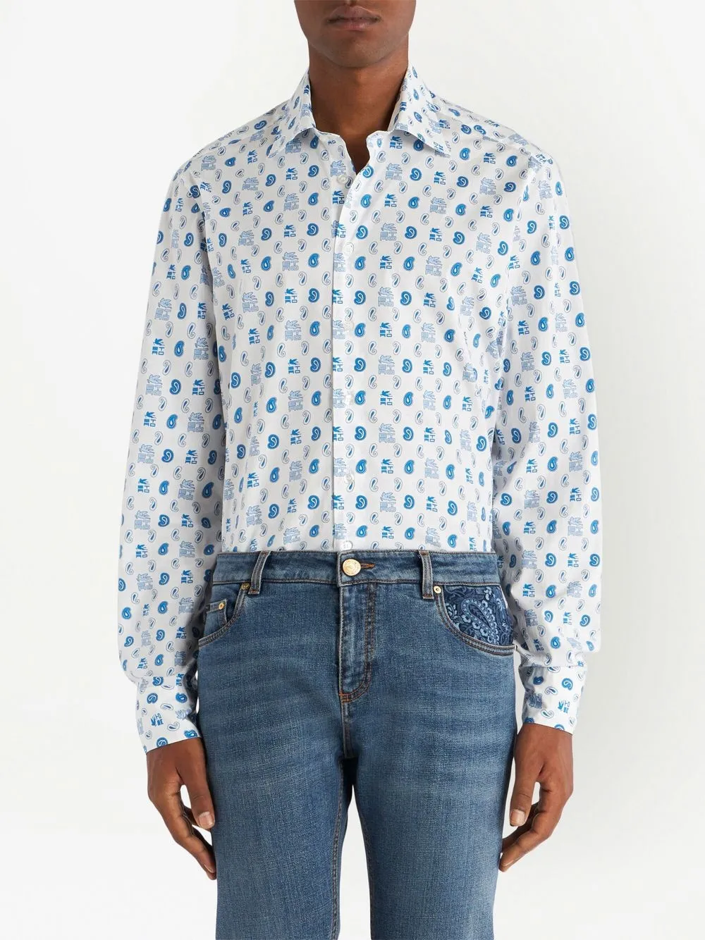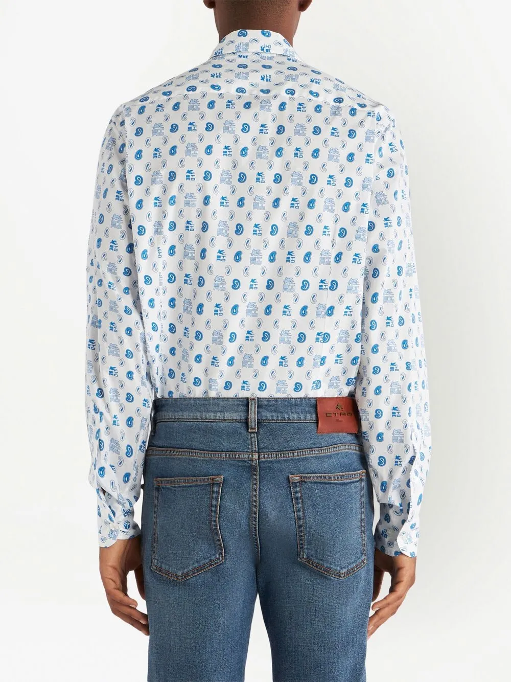 Смесовый хлопок, абстрактный принт, классический воротник, застежка на пуговицах спереди и длинные рукава.